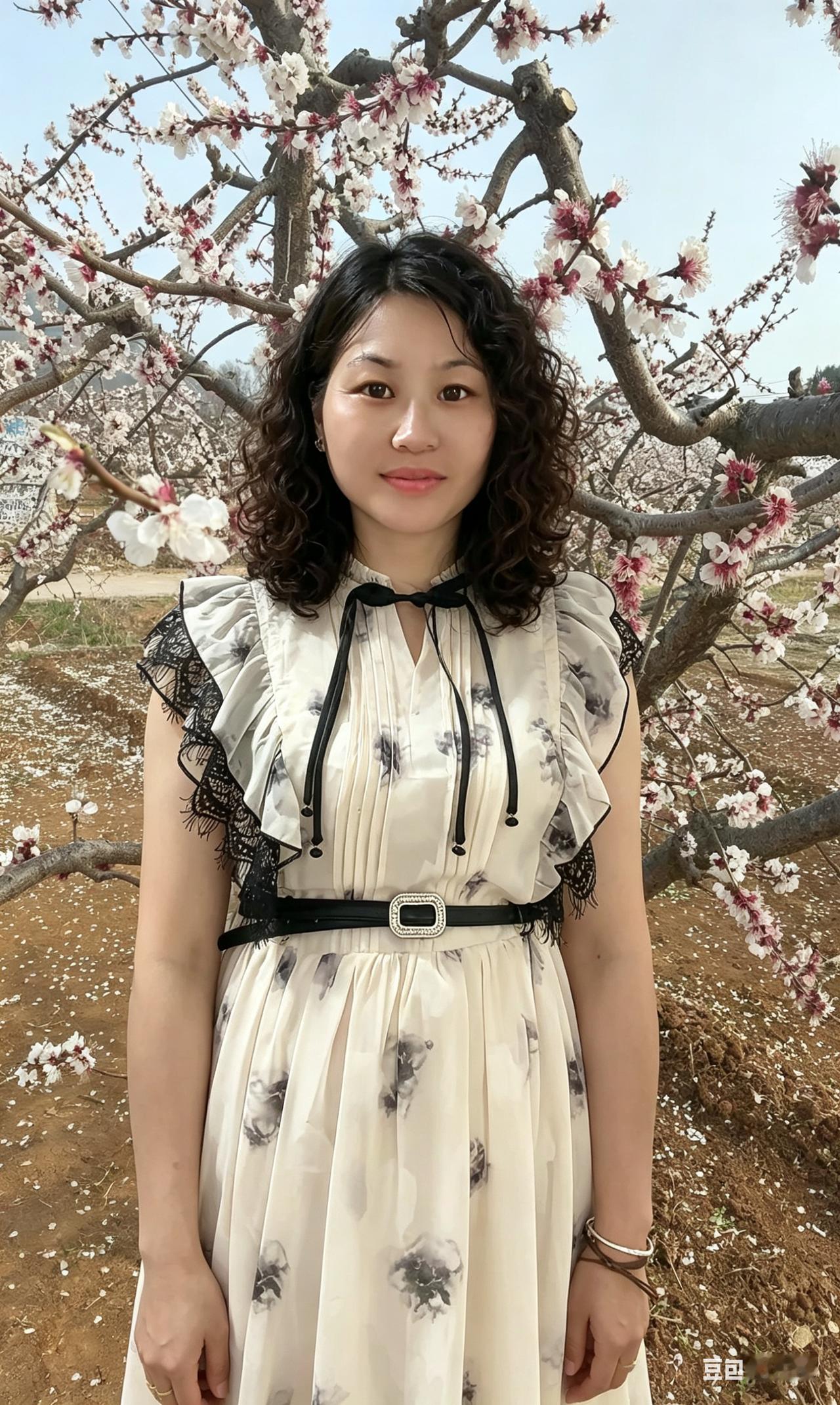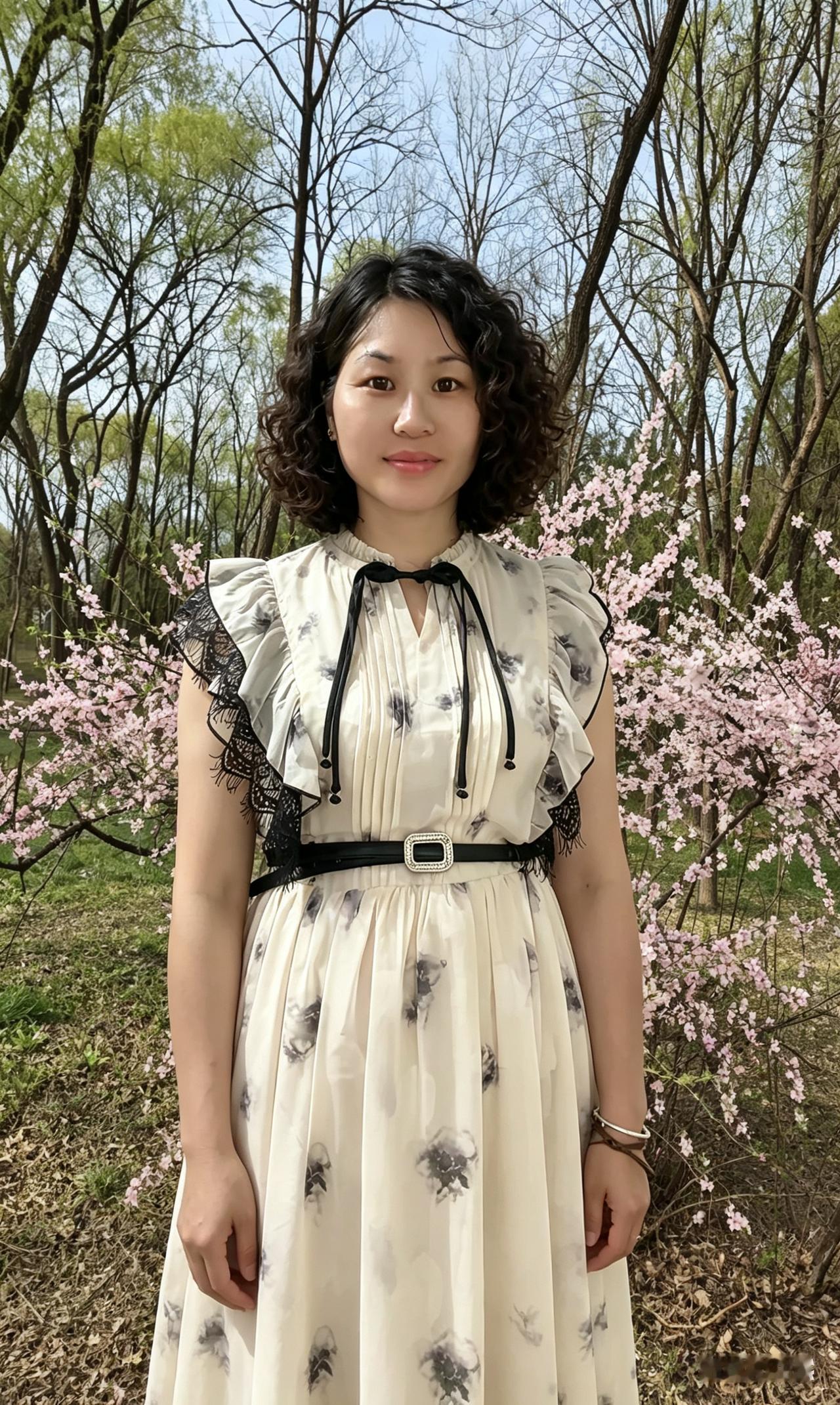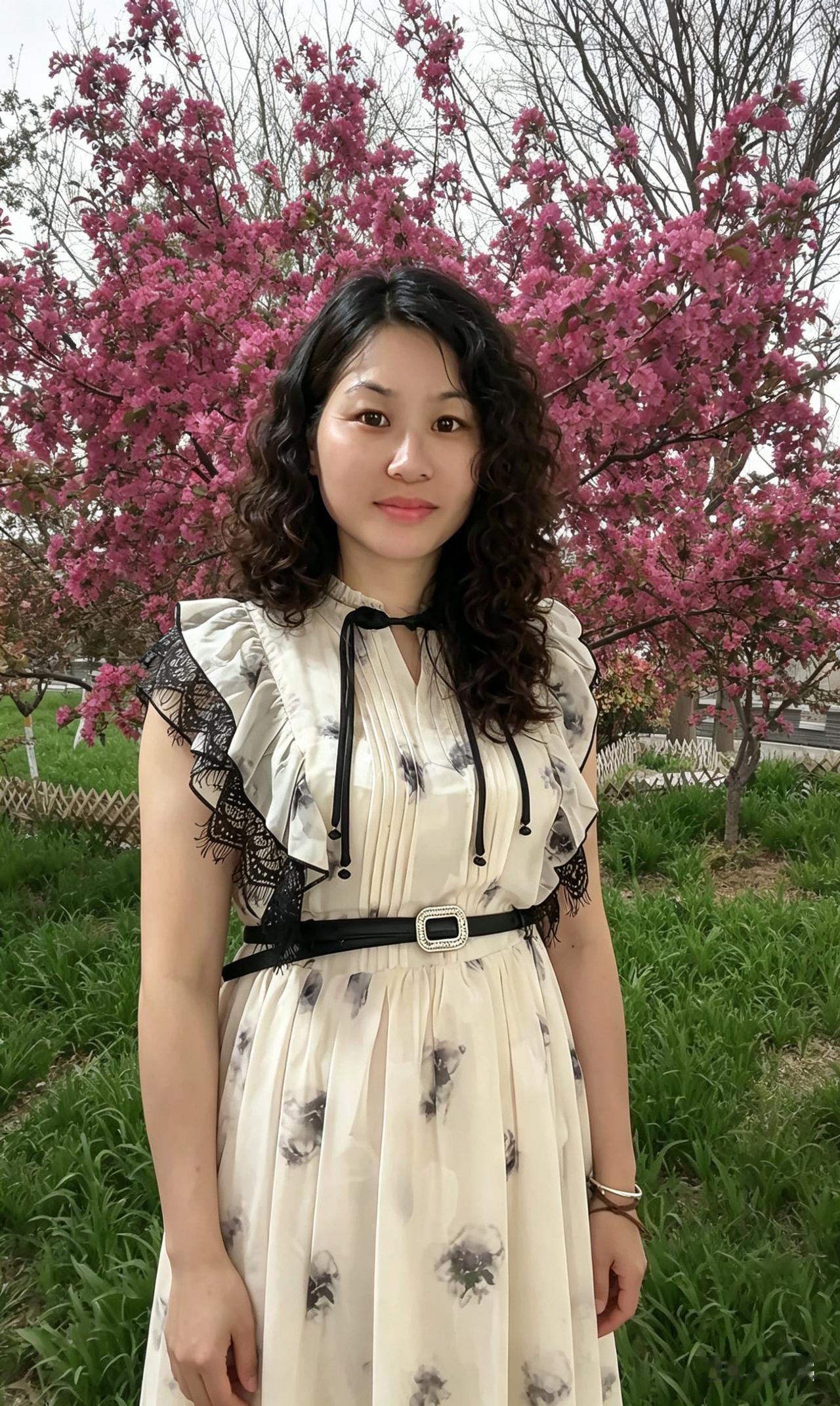 一树繁英映玉容,墨痕裙上淡烟浓。 山光水色皆为衬,最是人间温婉风。