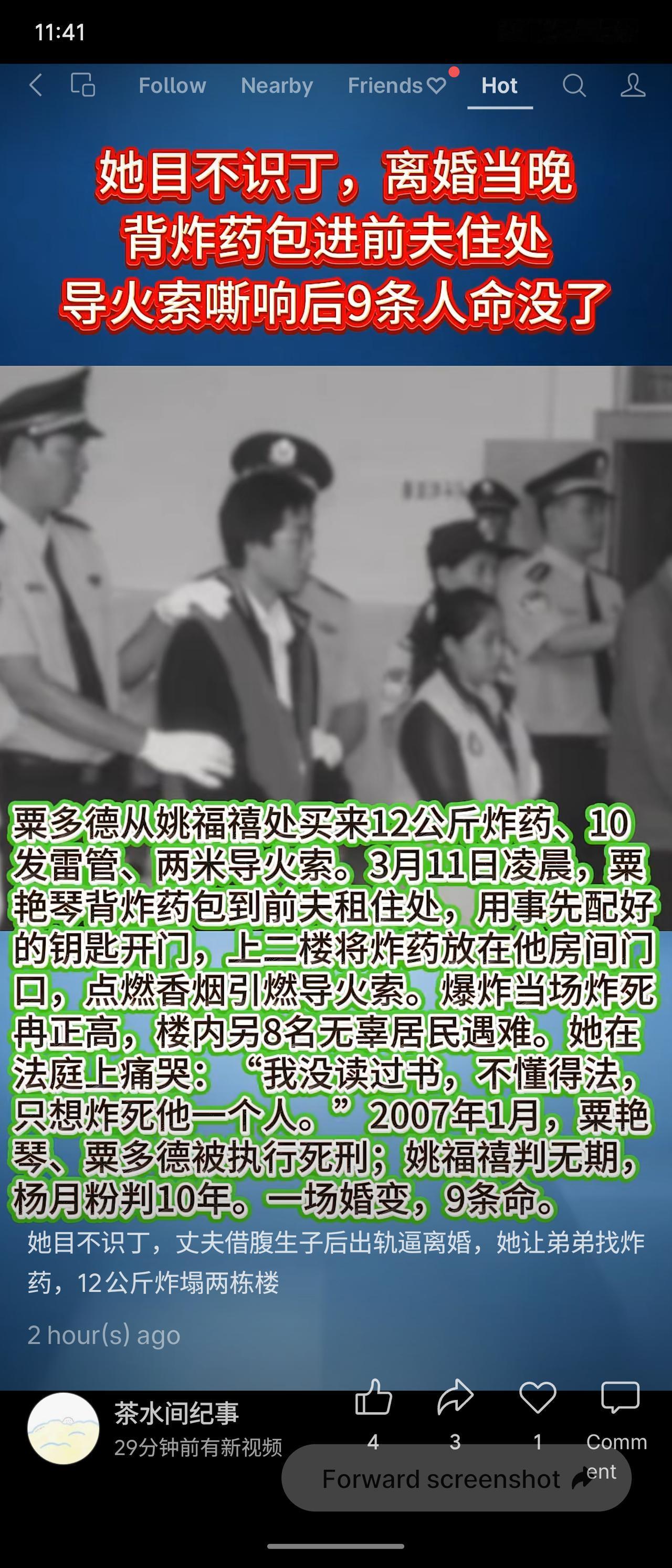 广西乐业县女子栗艳琴目不识丁,因丈夫冉正高借腹生子、出轨逼离婚,离婚当晚携带12公斤炸药炸毁前夫住处,致9死4伤,包括8名无辜居民。她痛哭称只想炸死前夫一人,不懂法律。2007年,栗艳琴及弟弟栗多德被执行死刑,买卖炸药者分获无期与十年。一场婚变酿成惨烈悲剧。