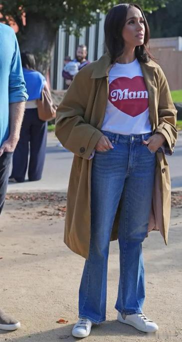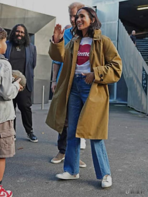 第一套无袖短裙搭配黑色裤袜,露出两条纤细的腿,更显梅根好身材。第二套白色T恤搭配卡其色风衣和蓝色牛仔裤,低调随性,十分符合梅根的松弛感。