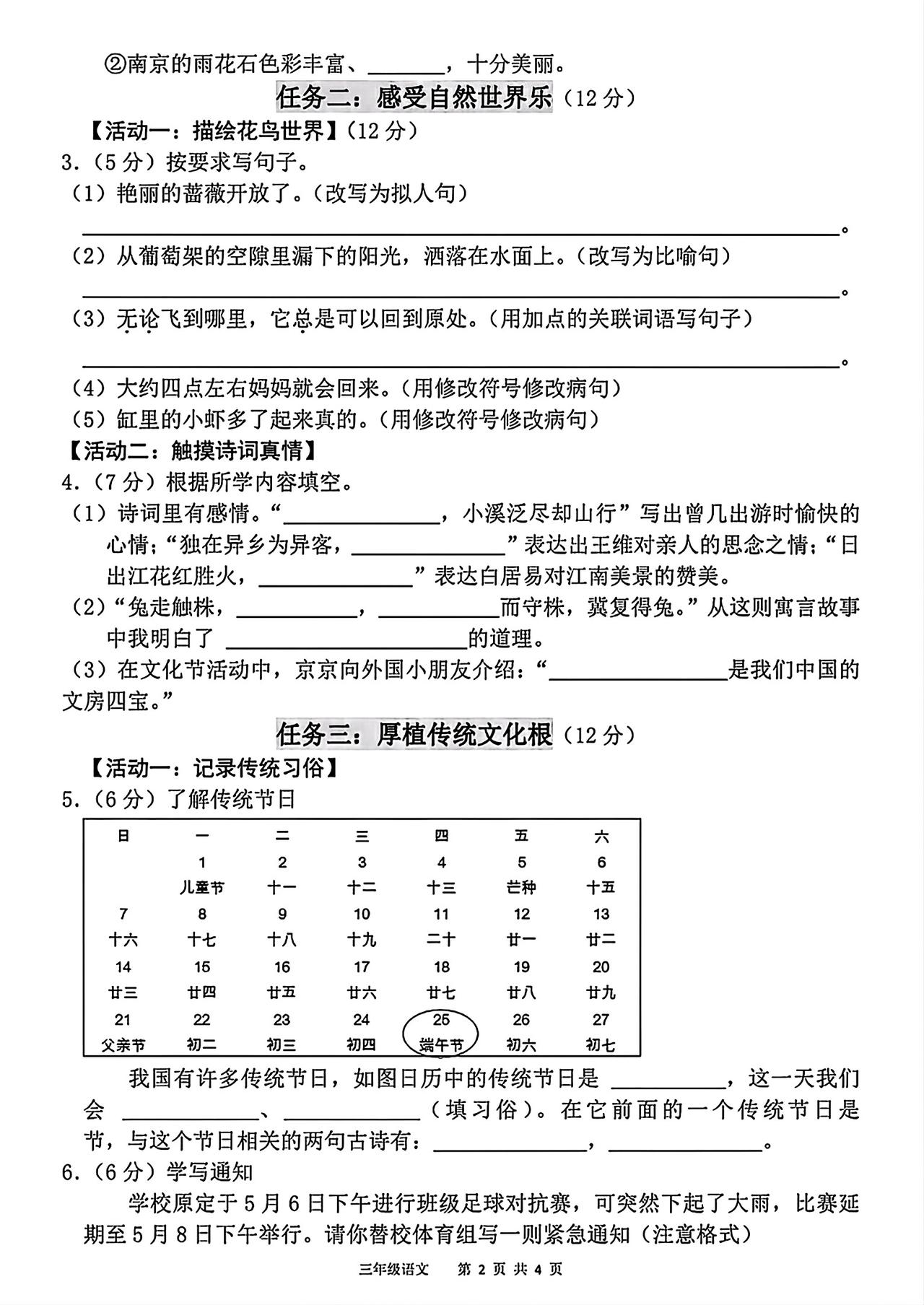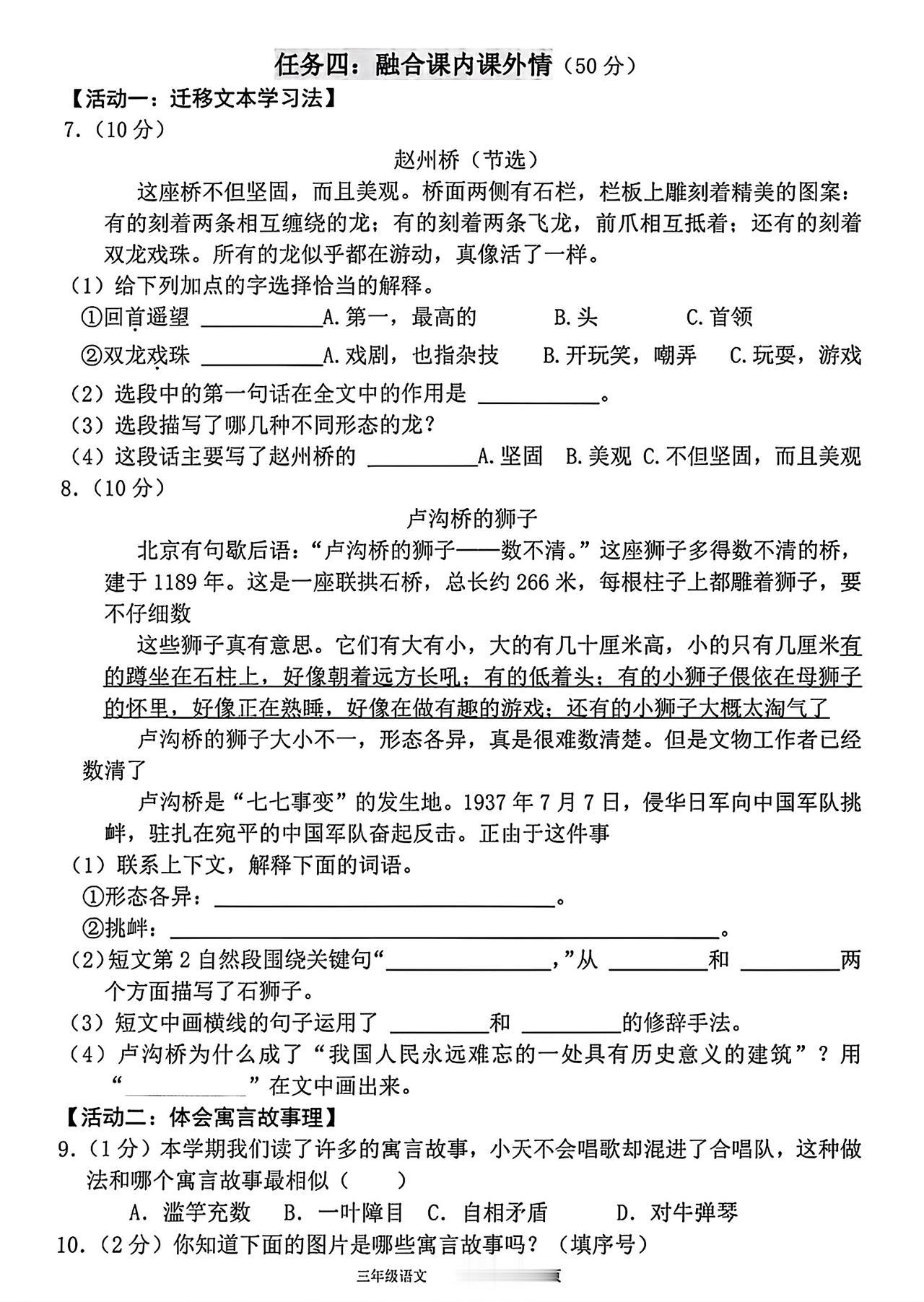 26春三年级下册语文,期中综合素养测试卷及参考答案,收藏备用