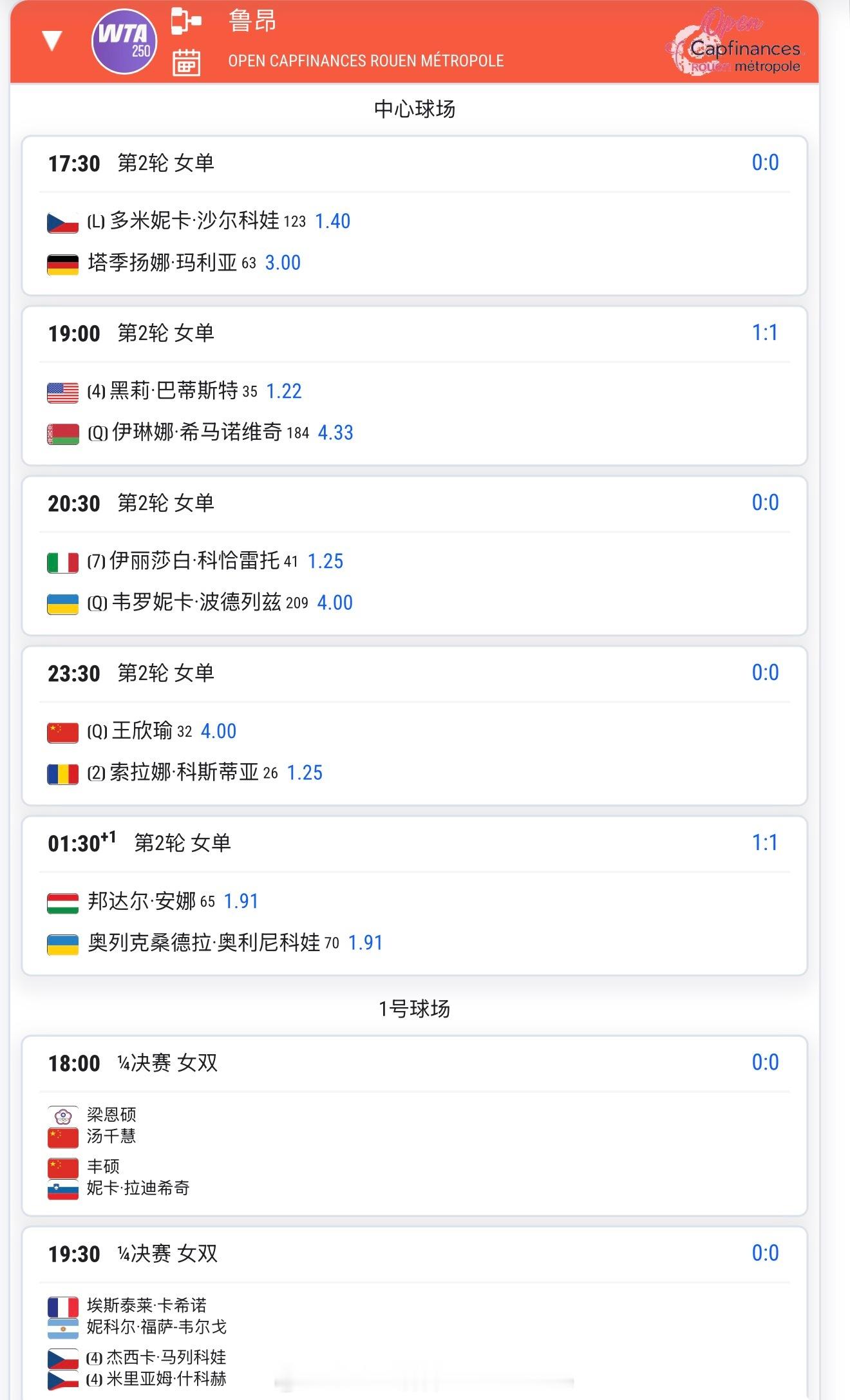 23:00莱巴金娜vs施内德22:00张帅女双23:30王欣瑜vs科斯蒂亚