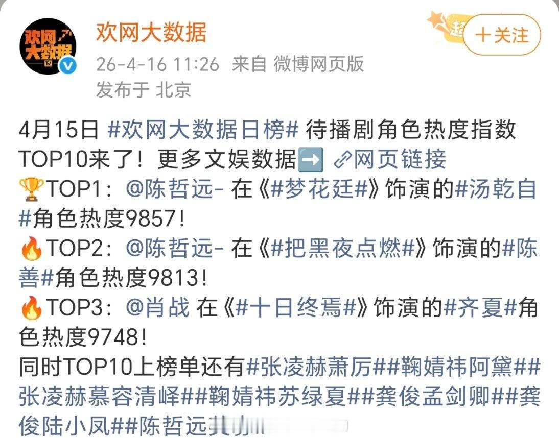 待播剧角色热度指数榜,陈哲远前三占二👍梦花廷—汤乾自 把黑夜点燃—陈善