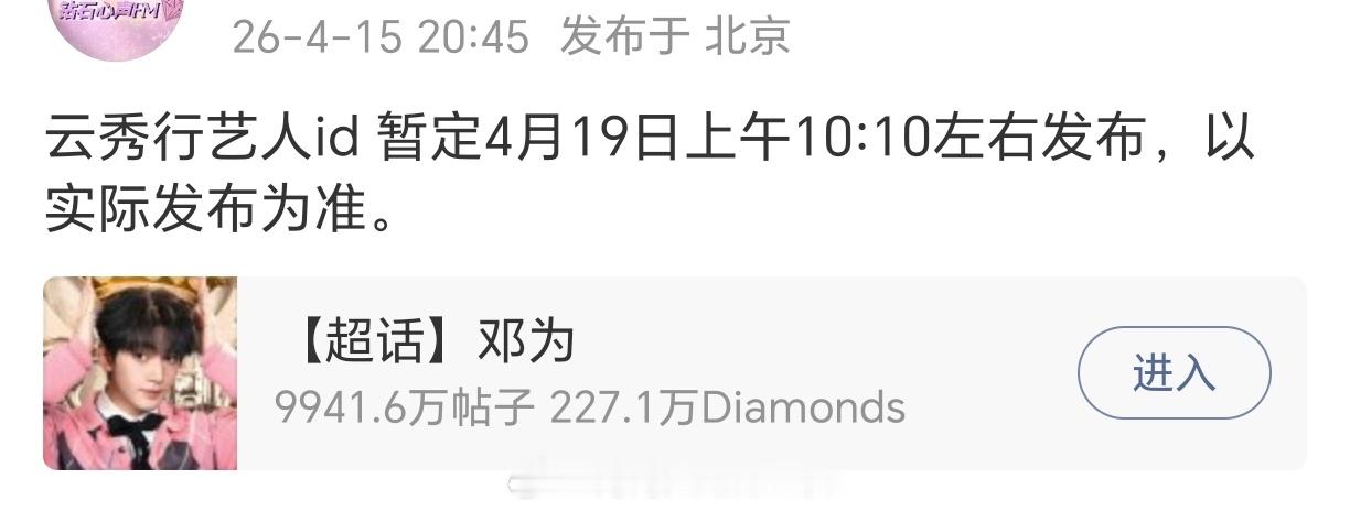 邓为 央视的五四晚会行程确定!去年央视五四晚会就帅的很出圈,期待今年的!云秀行也