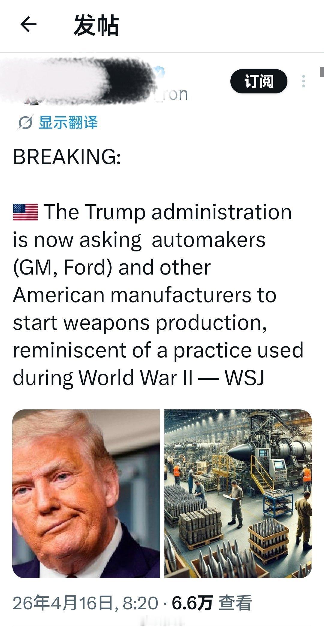 突发新闻:特朗普政府现在要求汽车制造商(通用、福特)和其他美国制造商开始投入武器