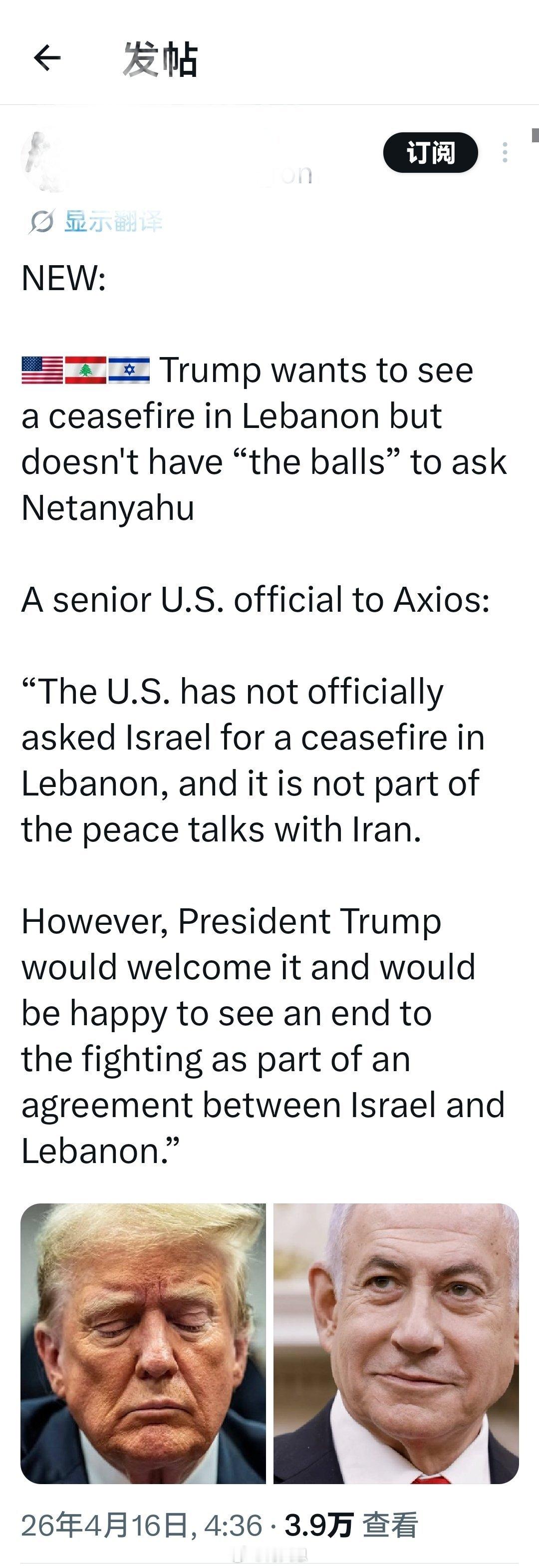 “美国尚未正式要求以色列在黎巴嫩停火,不承认这是与伊朗和平谈判的一部分。