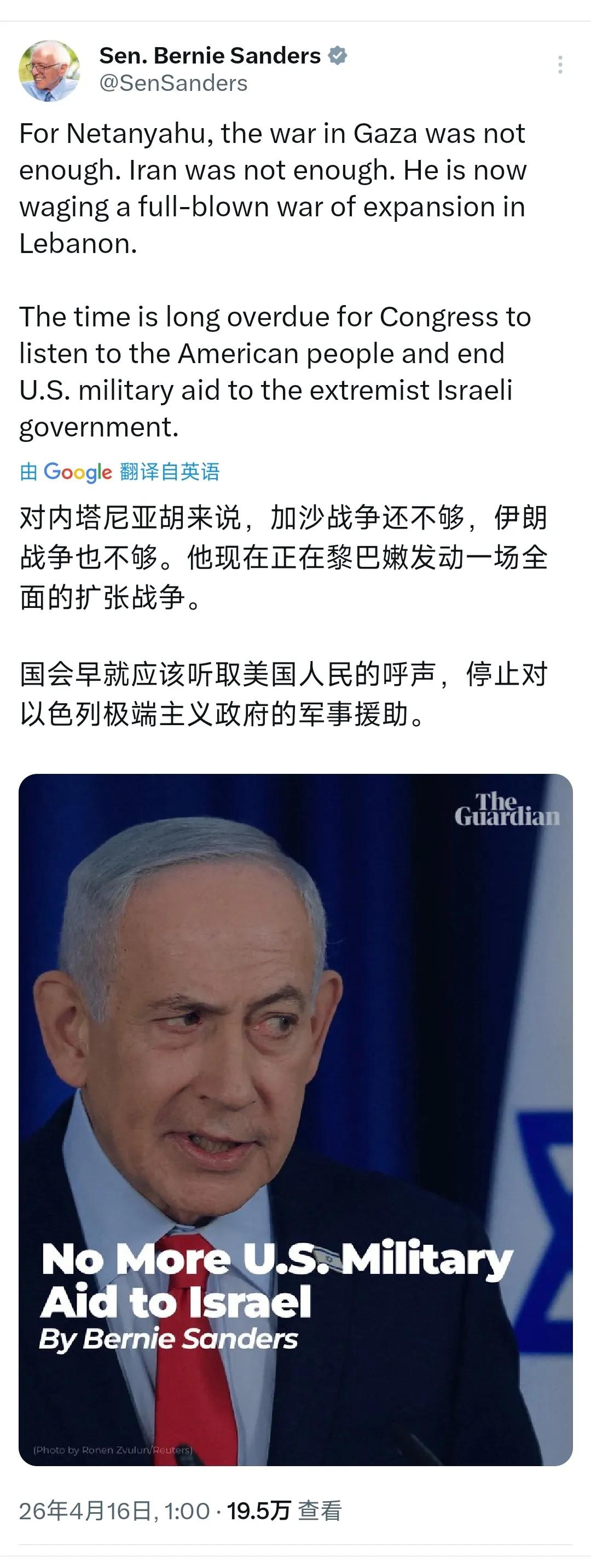 美国民主党籍参议员桑德斯,怒斥内塔尼亚胡:加沙战争没结束,美伊刚缓和局势,以色列又在黎巴嫩主动发动扩张战争。他要求美国国会听从民意,停止给以色列强硬政府提供军援,指责以色列靠着美国支援,不断蔓延中东战火。