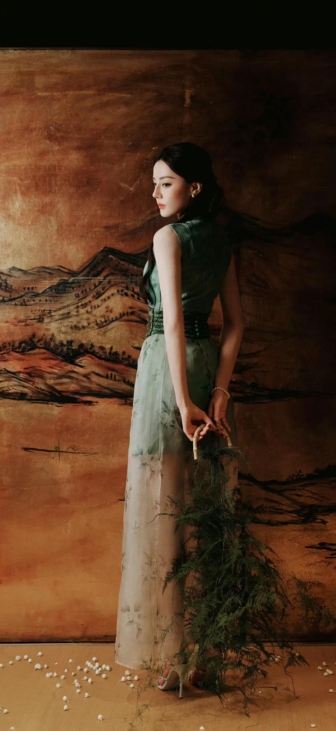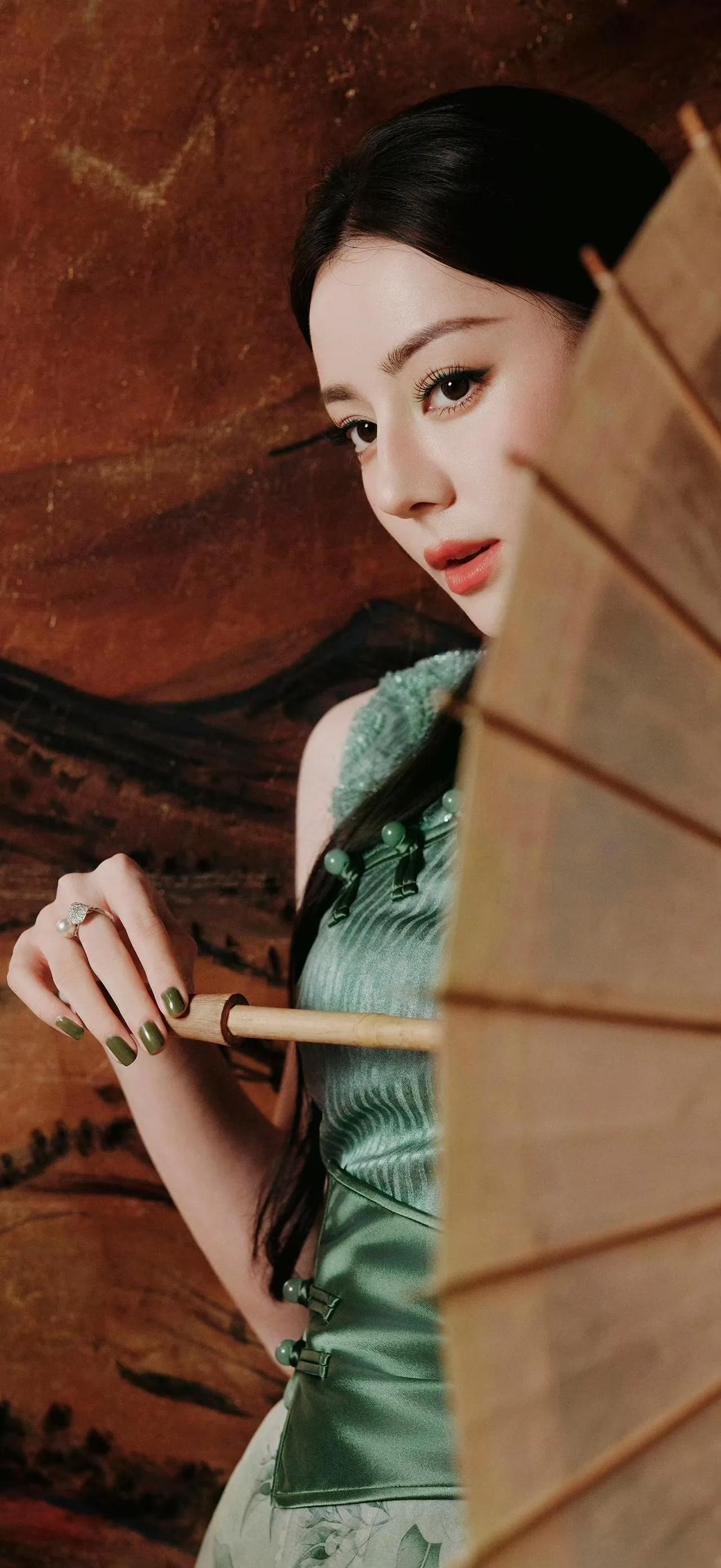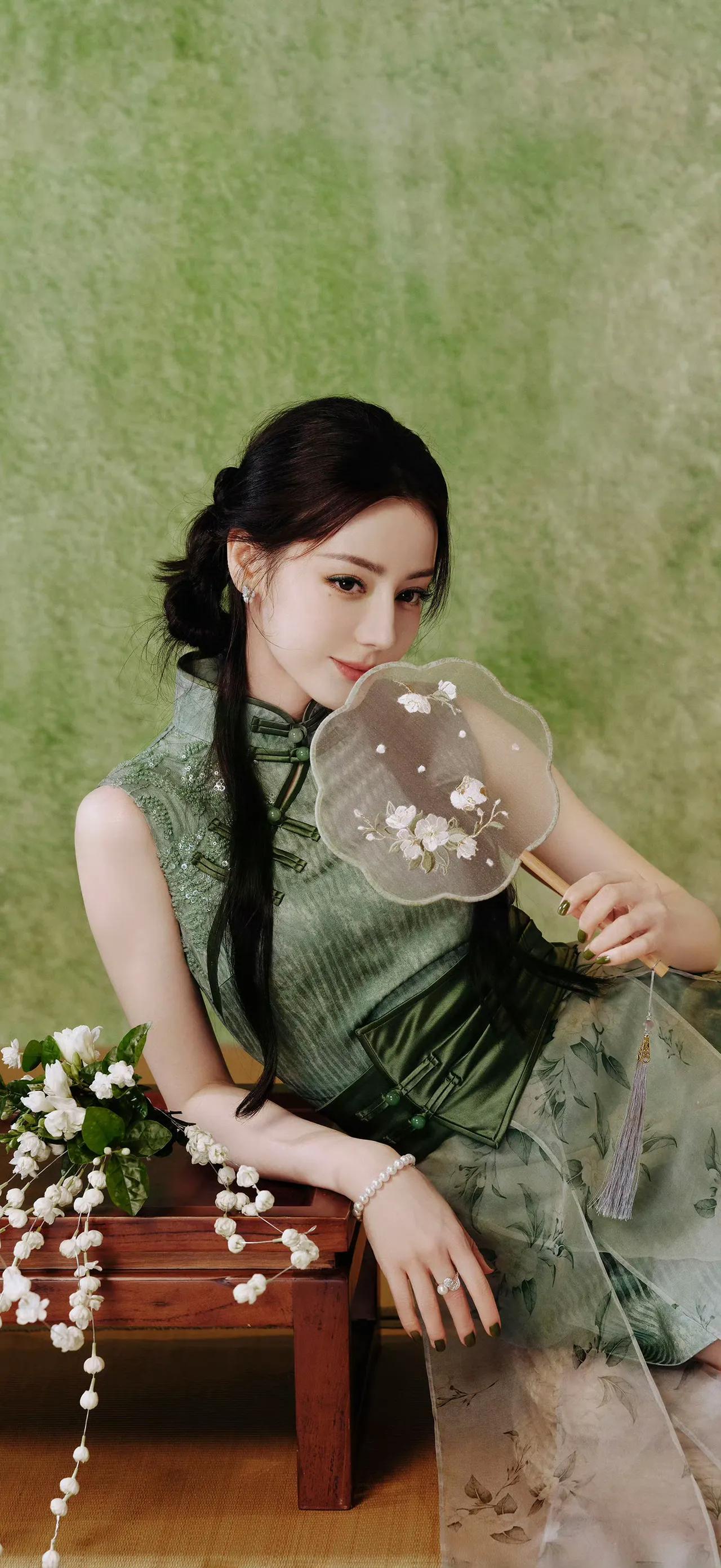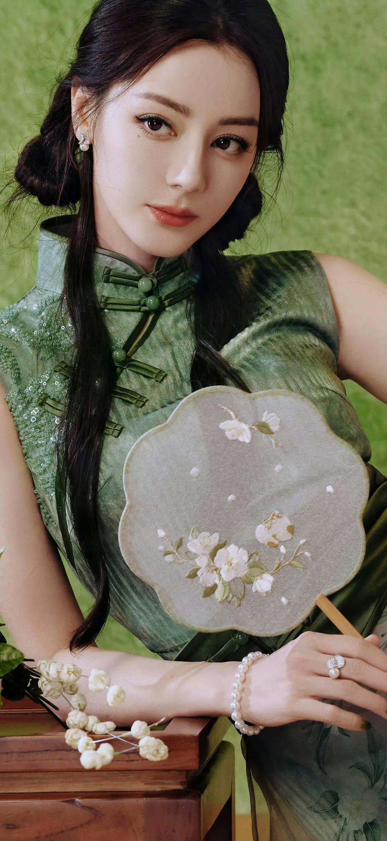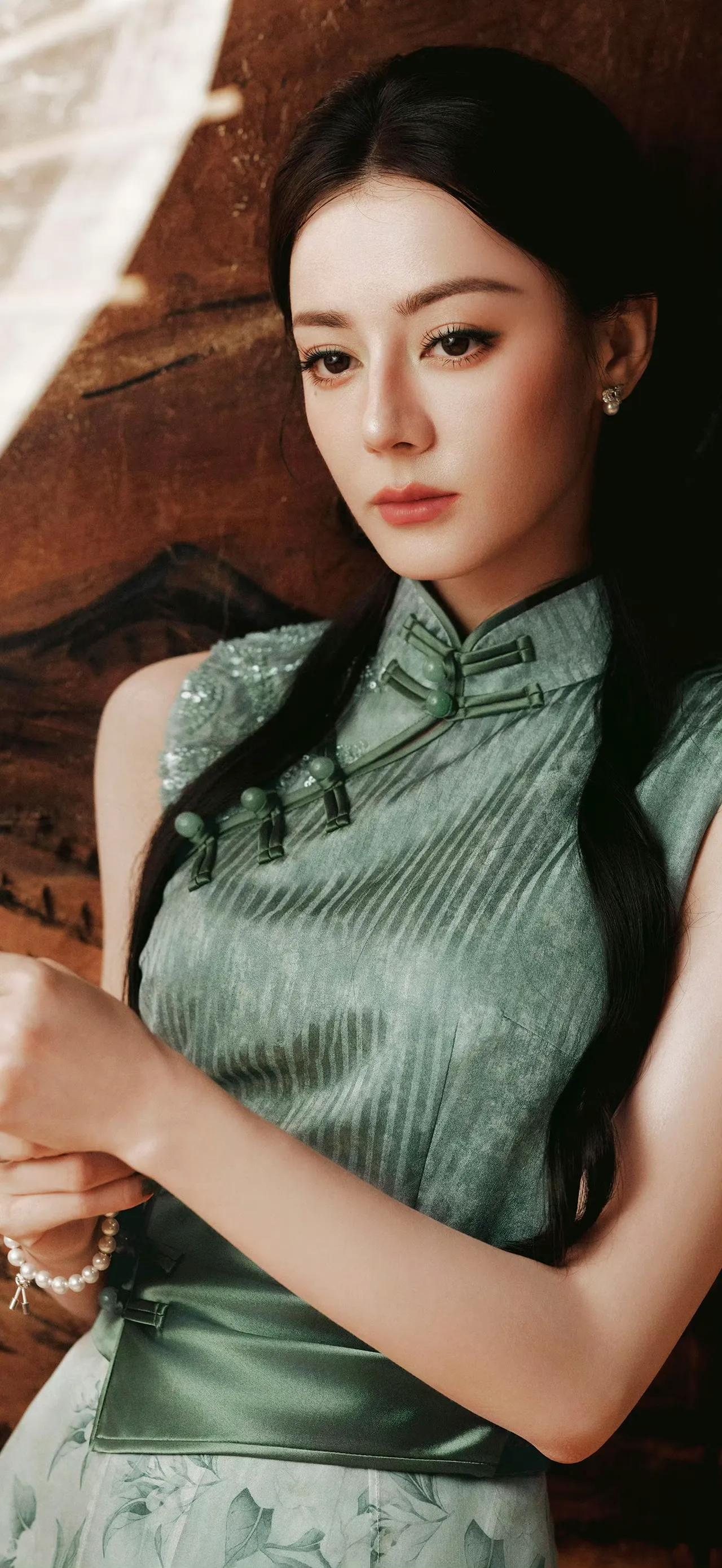 美女壁纸~迪丽热巴,青衫雅韵,东方佳人 一袭青绿色改良旗袍,勾勒出东方女子的温