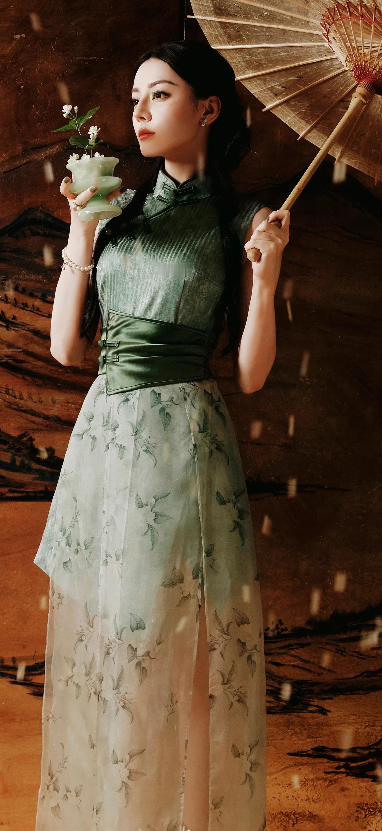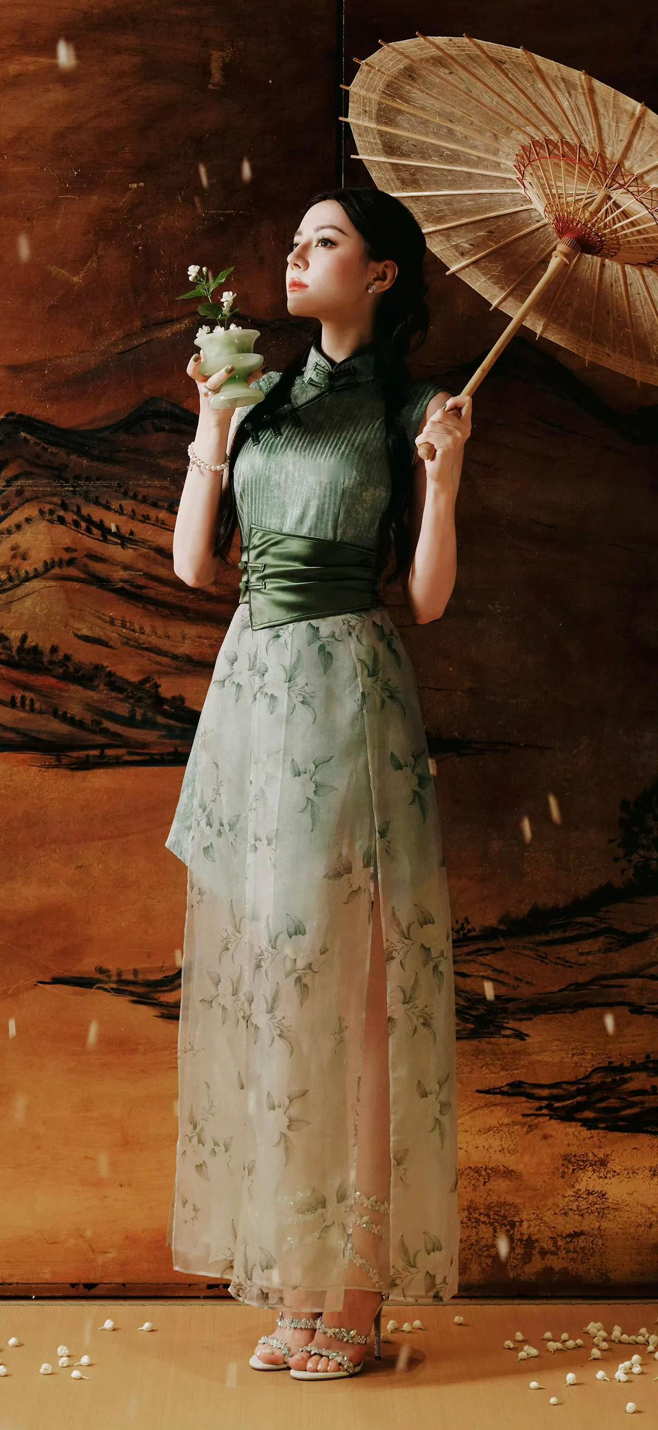 一袭青绿色改良旗袍,勾勒出东方女子的温婉风骨。盘扣藏着岁月的雅致,纱裙晕染着江南的诗意,团扇轻摇,茉莉生香