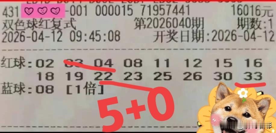 1.6万复式票拿下了5+0,很可惜红球14没有要。其实,明码扎堆出现的时候,是万元票的机会,很奇怪,打了这么多号码,14居然没有塞进去。
