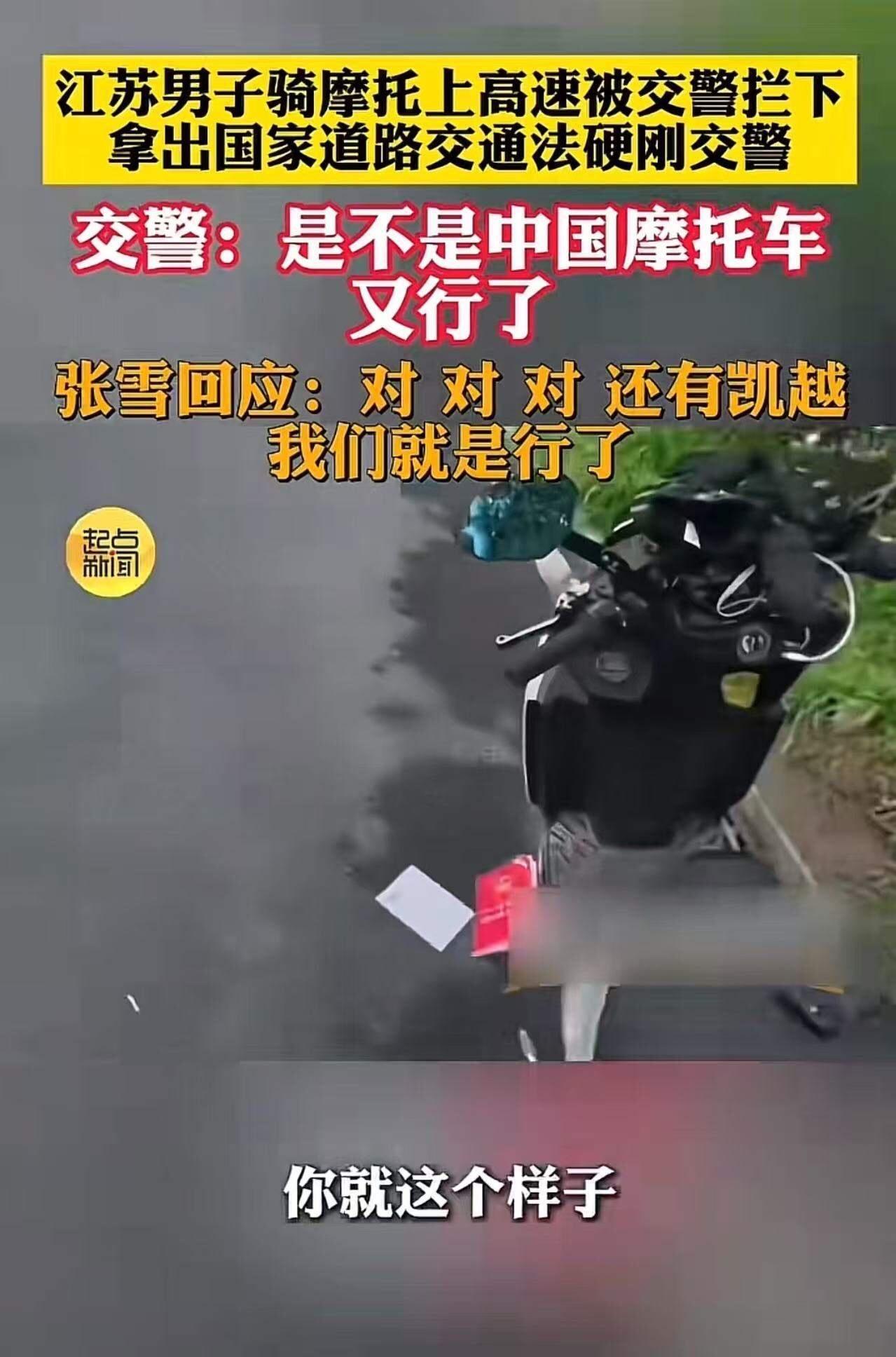 江苏,男子骑摩托车上高速被交警拦下,拿出国家道路交通法硬刚交警!交警:“是不是中国摩托车又行了,把你能耐的?”那么问题来了,你支持交警还是男子?