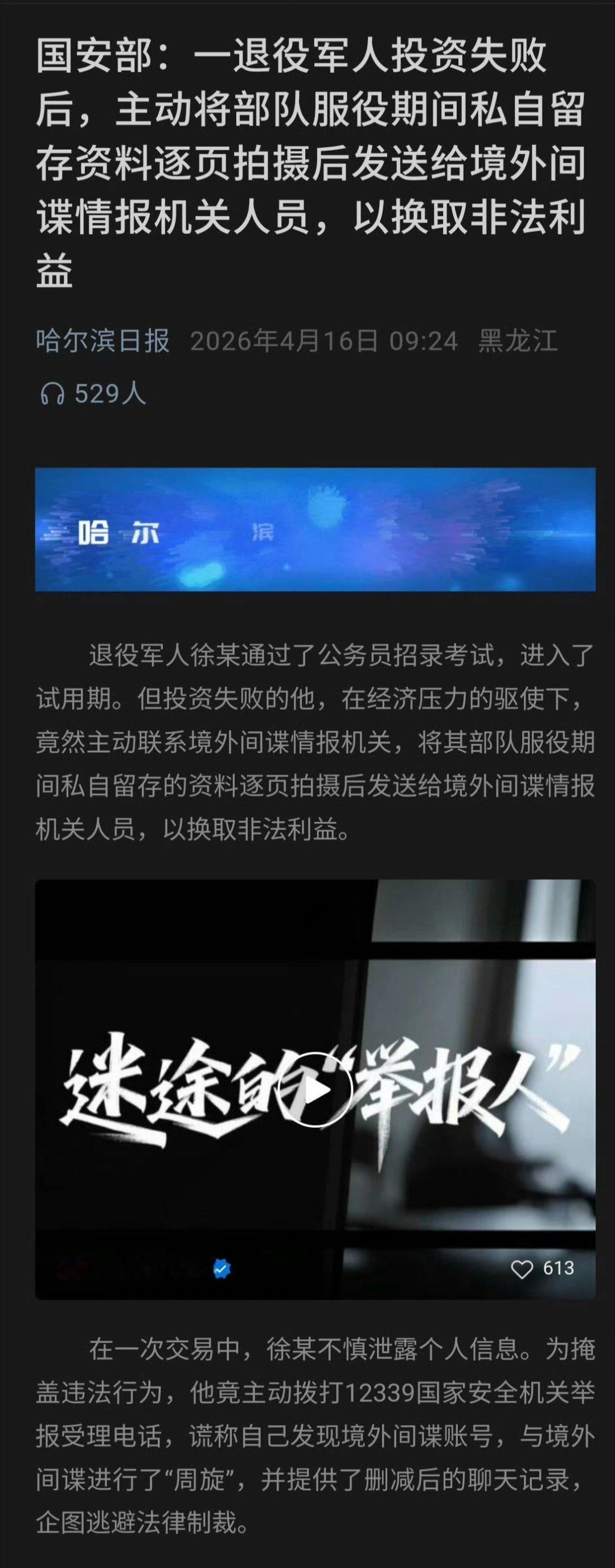 一退役军人投资失败后,主动将部队服役期间私自留存资料逐页拍摄后发送给境外间谍情报机关人员,以换取非法利益 ,最终被行政拘留5天……热点观点