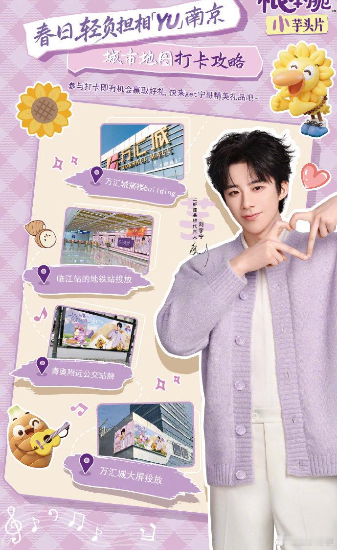 在南京偶遇了刘宇宁 滴滴!属于南京摩饭的专属打卡路线来啦!从10号线临江地铁站的“途经浪漫”,到青奥公交站的“心动降临”,最后去万汇城一楼大中庭和室外大屏感受“星光定格”~一路春光,一路有宁!速速收藏这份春游路线图,带上轻松好心情,去南京街头和老大相“YU”吧!