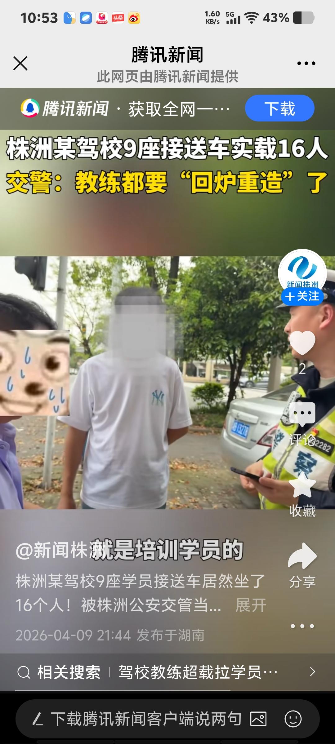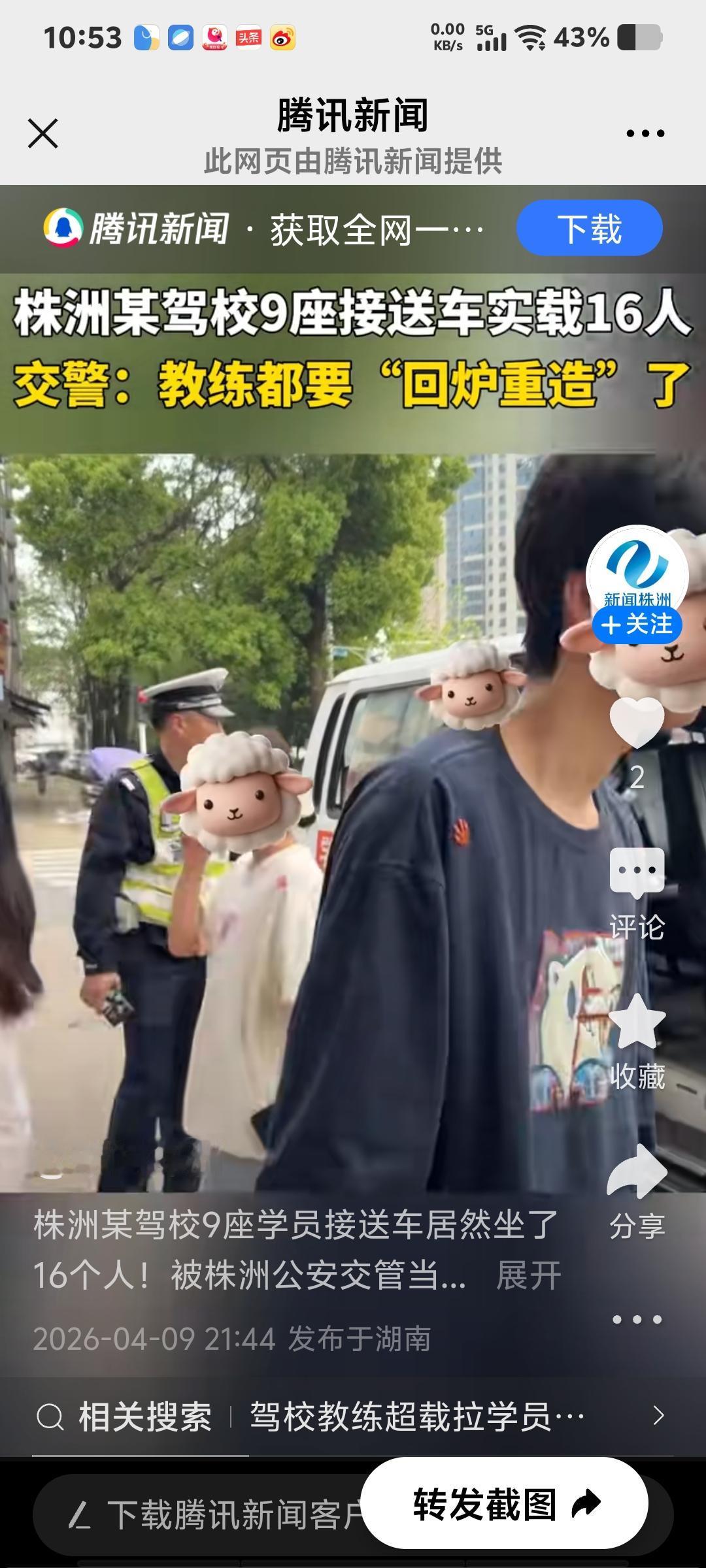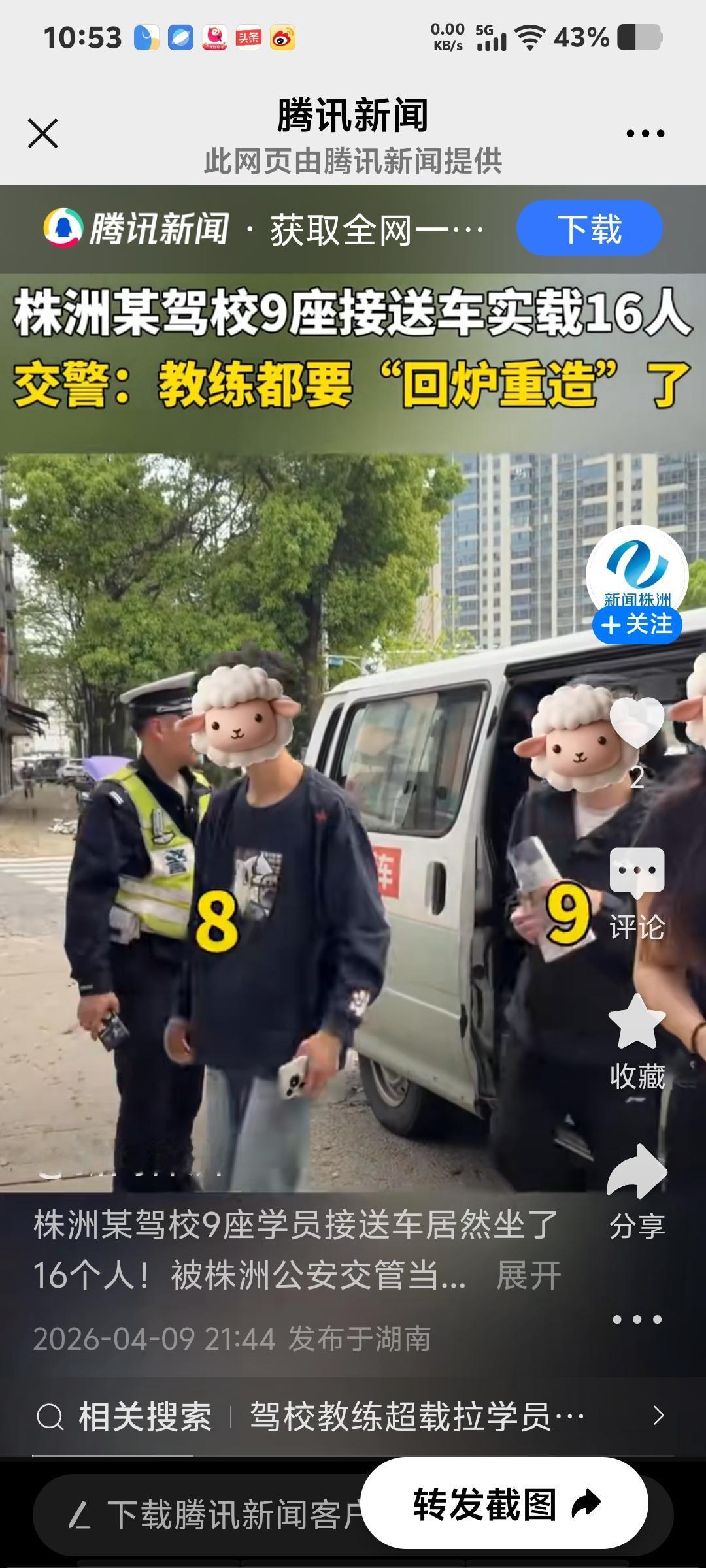 近日,株洲某驾校的9座学员接送车竟然坐了16个人,被株洲交警当场查获。根据《道路交通安全法》第四十九条,机动车载人不得超过核定的人数。该车超载比例达77.8%,属于“严重超载”情形(信息来源:4月9日腾讯新闻)。