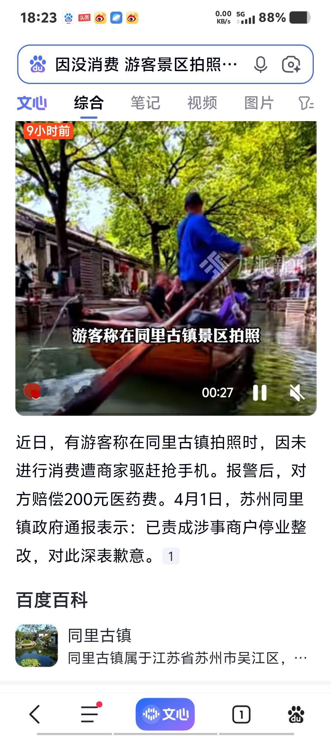 苏州同里古镇,一游客因没有消费,被一商家追打并抢手机。杭州西湖苏堤景点,一游客散发小广告,保安劝阻未果。该保安竟跟游客互相吐口水(信息来源:3月31日九派新闻)。