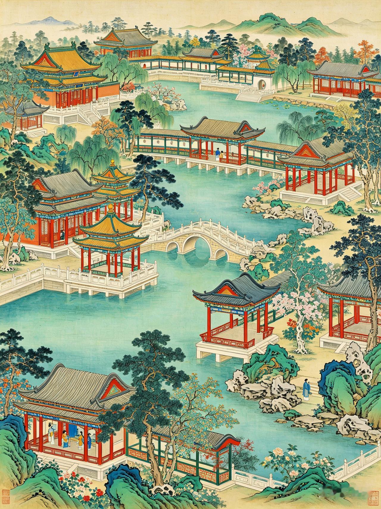 宫廷画师沈源、唐岱绘制,完整记录圆明园全貌,是研究园林历史的核心史料,全套40幅被法国掠走,至今藏于法国国家图书馆,从未归还。