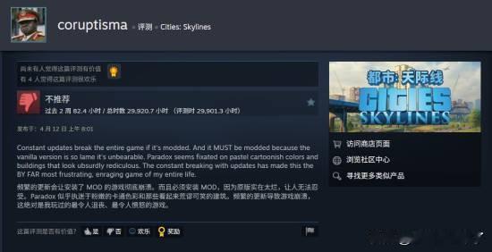 一般来说,一个在同一款游戏里玩了3万小时的玩家,应该是死忠粉。但现实却相反:一名玩家在《城市:天际线》Steam页面留下了非常负面的评价。