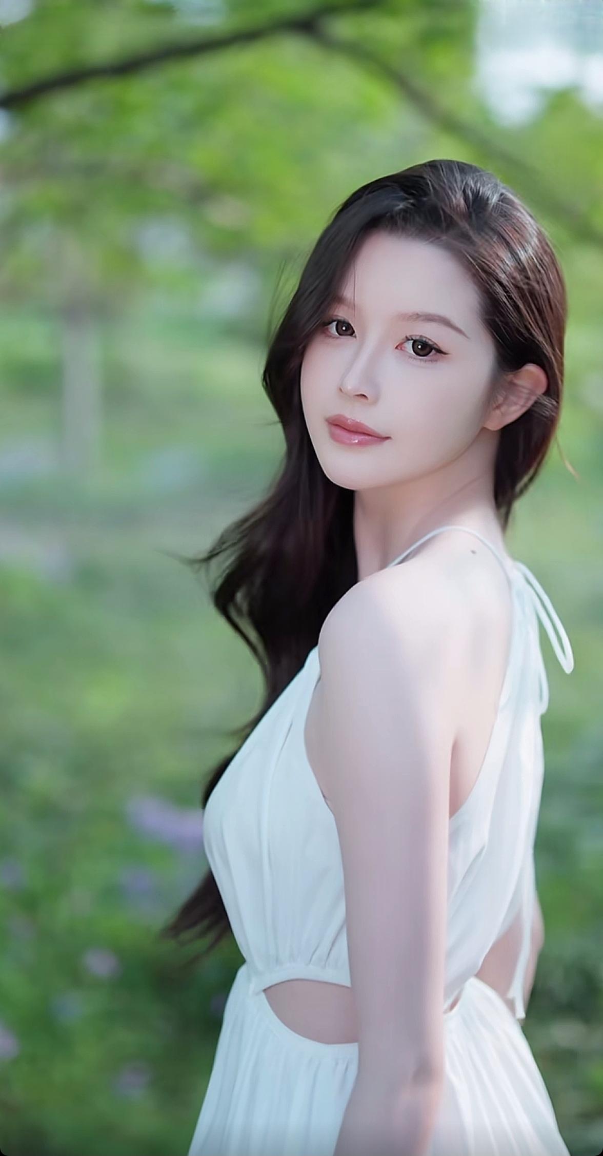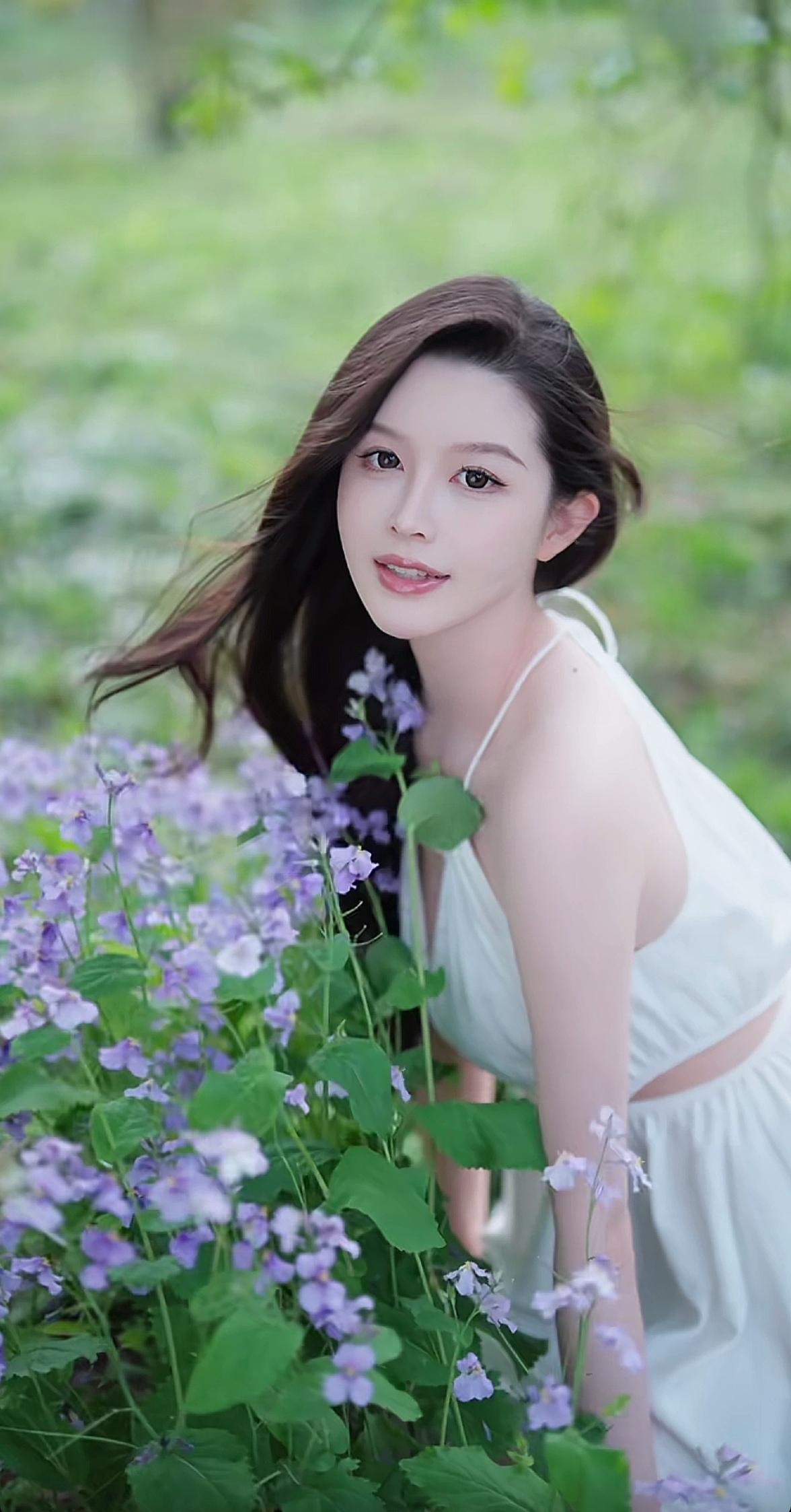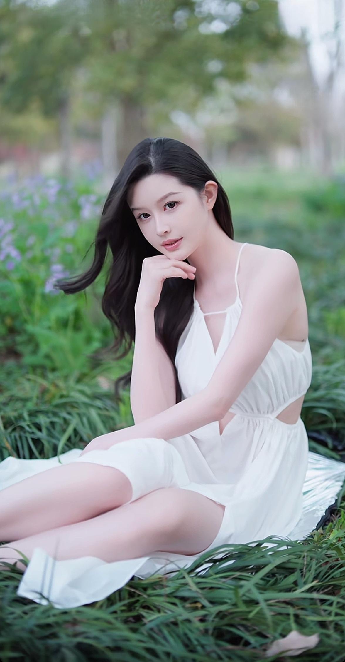 在绿意盎然的公园里,她穿着白色连衣裙,温柔地躺在草地上,仿佛一幅浪漫的画卷。
