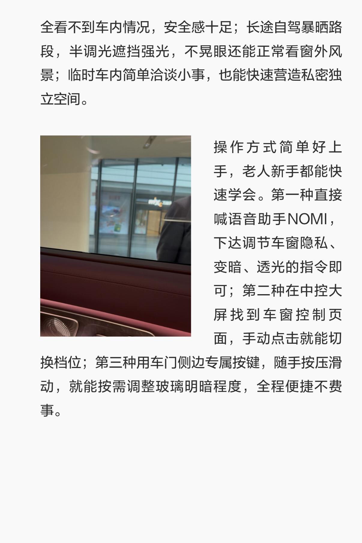 操作方式简单好上手,老人新手都能快速学会。第一种直接喊语音助手NOMI,下达调节车窗隐私、变暗、透光的指令即可;第二种在中控大屏找到车窗控制页面,手动点击就能切换档位;第三种用车门侧边专属按键,随手按压滑动,就能按需调整玻璃明暗程度,全程便捷不费事。