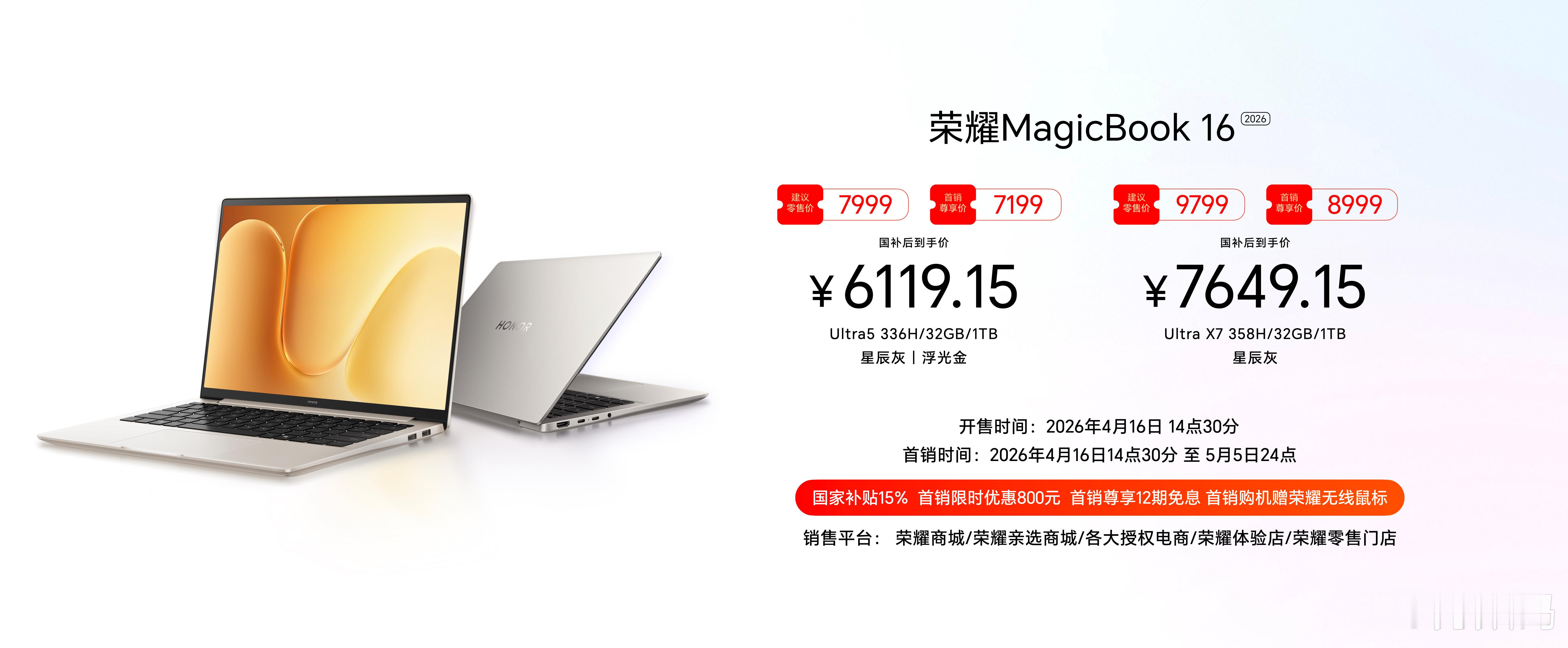 荣耀MagicBook 14|16,能养虾的笔记本,搭载第三代英特尔酷睿Ultra处理器,全系标配92Wh大电池,32G+1T,国补后5949.15元起。