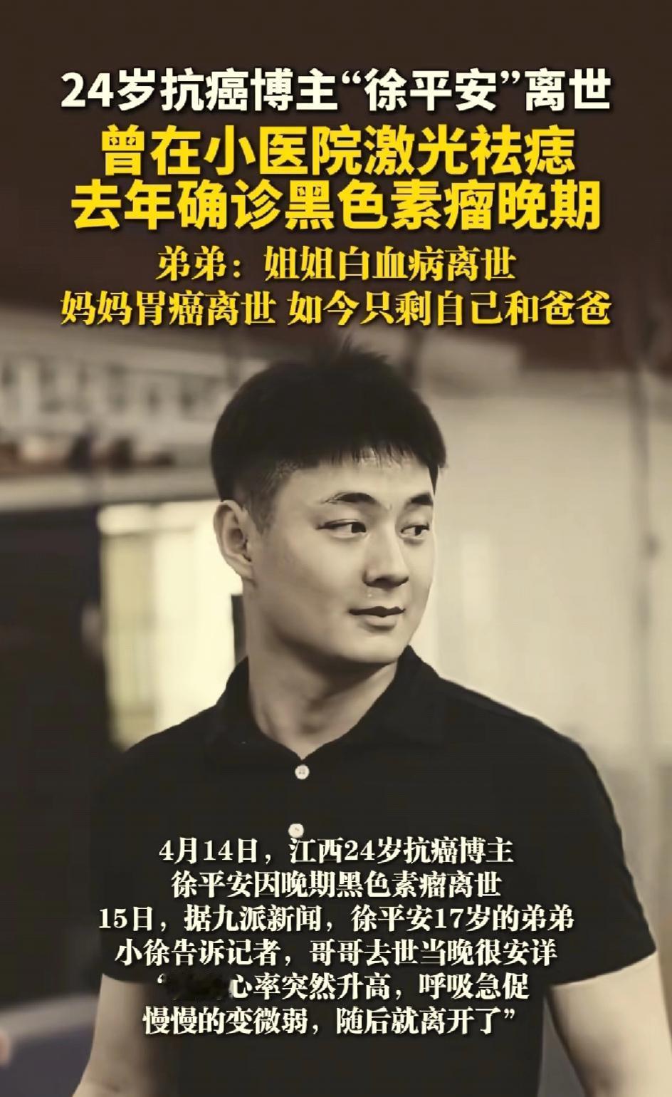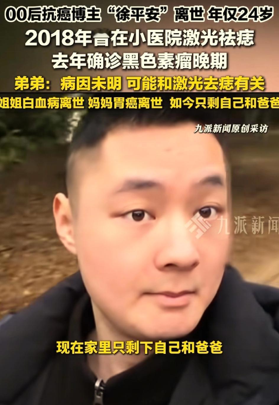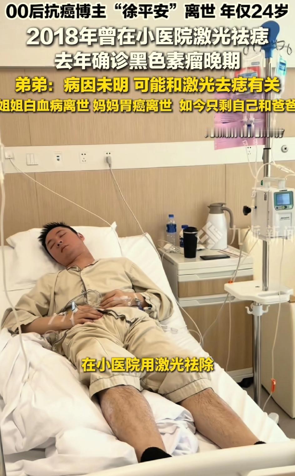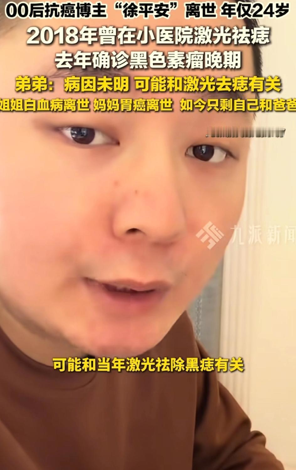 00后抗癌博主徐平安去世,之前激光去了一颗痣。屋漏偏逢连夜雨,麻绳专挑细处断。抗癌博主许平安离世。引发大家思考一个问题,身上的黑色痣到底要不要去除?是激光去除还是手术去除?还是不管不问?之前他的爸爸因为出车祸眼睛受伤,失去了劳动能力,只能卖菜为生。他的妈妈胃癌离世,他的姐姐白血病律师,他还有一个上高中的弟弟。他自己刚刚工作,很努力考研 很努力养家,人长得又帅气。他是一个非常有责任心的孩子,压力太大,因为家庭的原因,工作的原因,学业的原因。这也是患病的诱因之一。他生病的时候,他的账号也没有火起来,并没有得到多少捐款。一直是弟弟休学,照顾哥哥。徐平安在生病的时候还要挣钱,给弟弟挣学费,给自己挣医疗费。弟弟说哥哥走的很安详,开始呼吸急促,心率快,慢慢呼吸微弱,人就离世了。医生说他的病因可能与2018年他到小医院把自己身上的痣用激光去除有关。