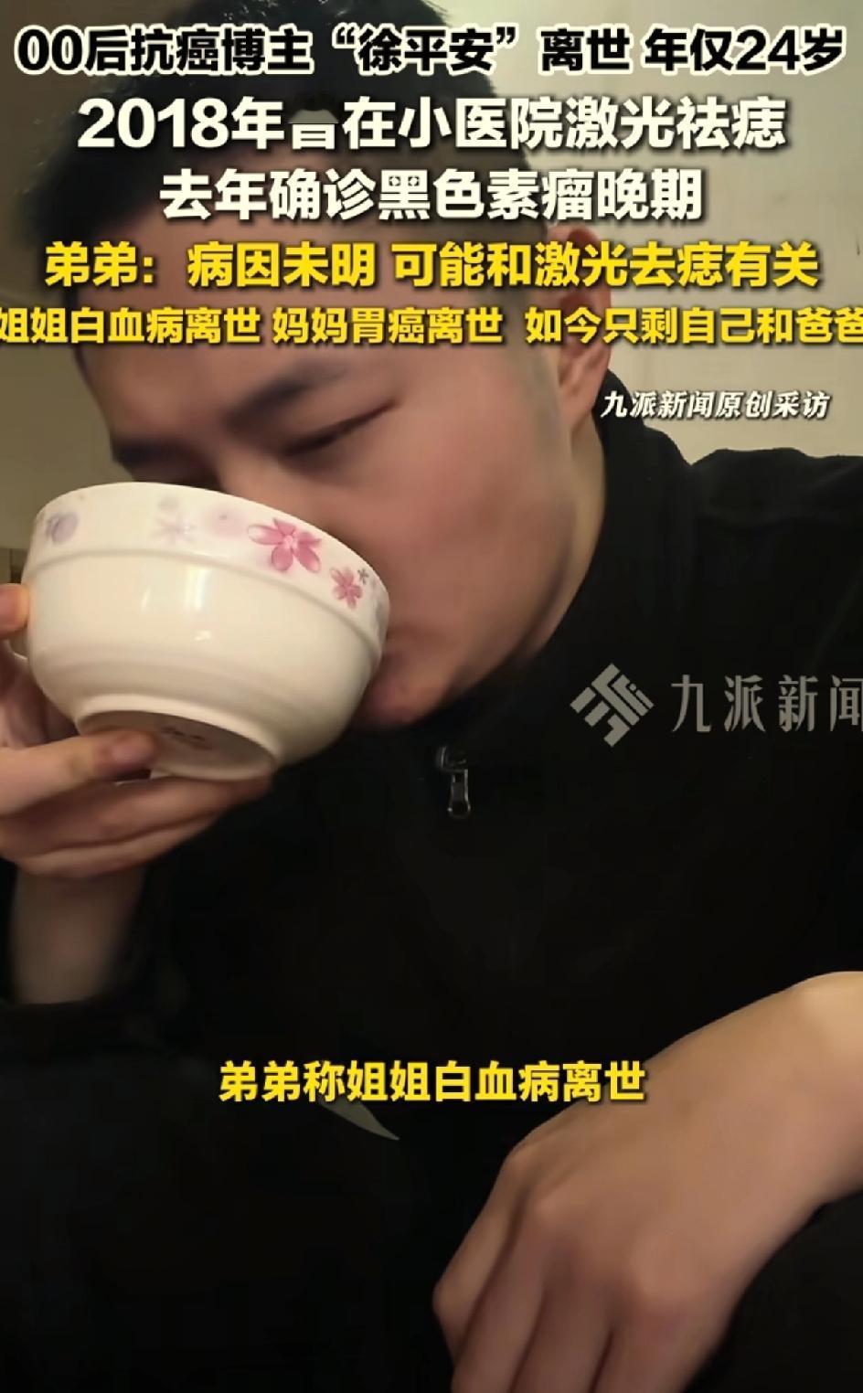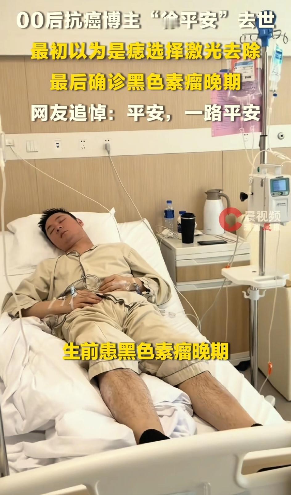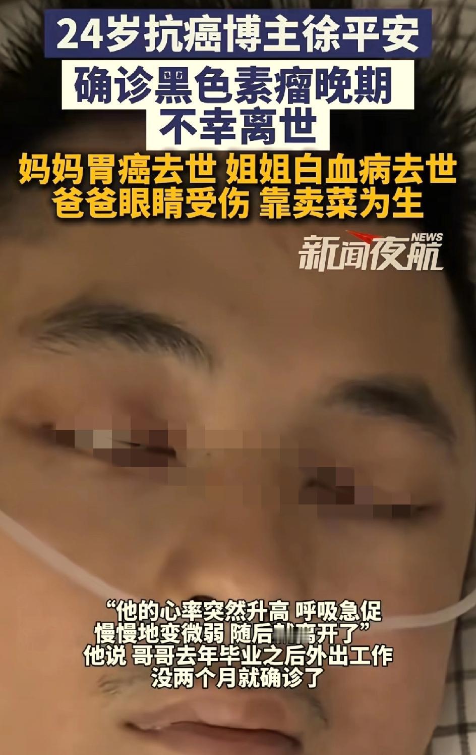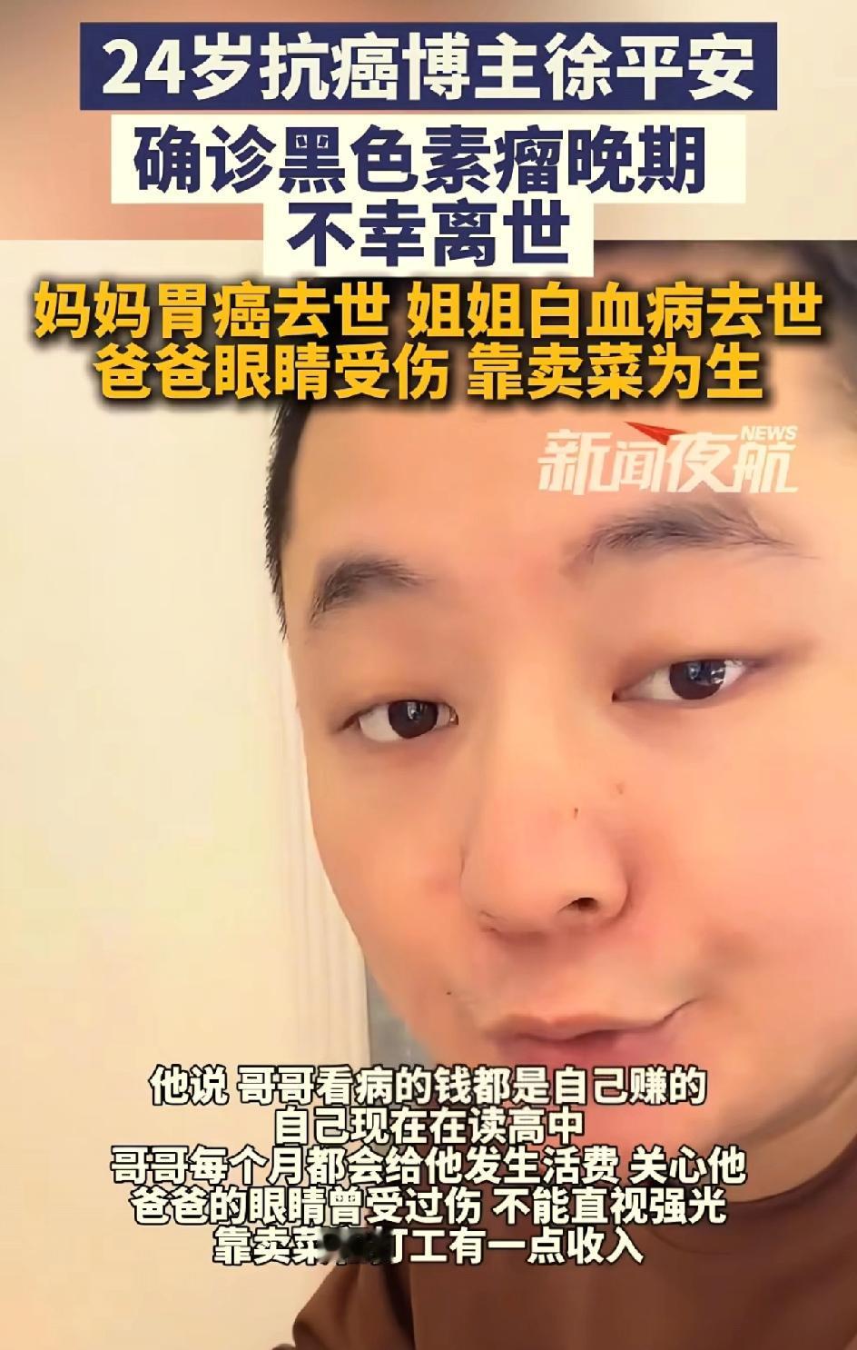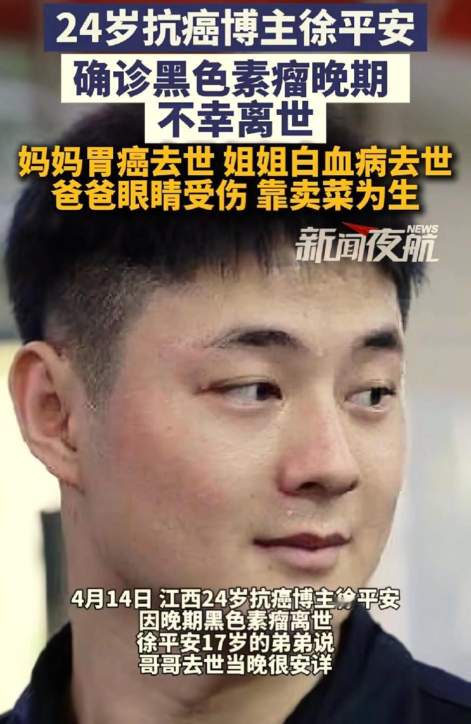 00后抗癌博主徐平安去世,之前激光去了一颗痣。屋漏偏逢连夜雨,麻绳专挑细处断。抗癌博主许平安离世。引发大家思考一个问题,身上的黑色痣到底要不要去除?是激光去除还是手术去除?还是不管不问?之前他的爸爸因为出车祸眼睛受伤,失去了劳动能力,只能卖菜为生。他的妈妈胃癌离世,他的姐姐白血病律师,他还有一个上高中的弟弟。他自己刚刚工作,很努力考研 很努力养家,人长得又帅气。他是一个非常有责任心的孩子,压力太大,因为家庭的原因,工作的原因,学业的原因。这也是患病的诱因之一。他生病的时候,他的账号也没有火起来,并没有得到多少捐款。一直是弟弟休学,照顾哥哥。徐平安在生病的时候还要挣钱,给弟弟挣学费,给自己挣医疗费。弟弟说哥哥走的很安详,开始呼吸急促,心率快,慢慢呼吸微弱,人就离世了。医生说他的病因可能与2018年他到小医院把自己身上的痣用激光去除有关。