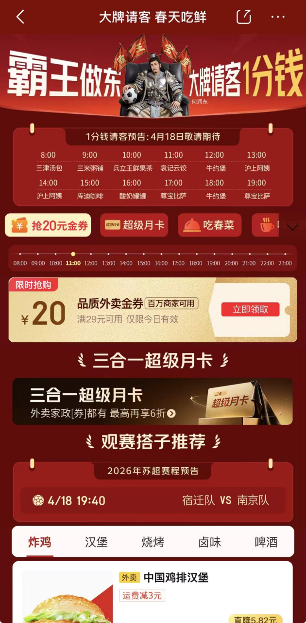 救命,这波跨界联动真的有点东西。4.18要在宿迁搞大事情,京东居然找回了当年做战甲的团队给何润东复刻造型。作为吃货我更关心的是,霸王这次还要请宿迁全城吃“霸王餐”。2000万外卖金券直接砸向宿迁,感觉全城的空气都变香了。4.16-4.18期间,每天8点开始每个整点都能去抢宿迁专享20元外卖金券。我已经把【网页链接】存好了,大家记得去京东APP,点秒送频道或京东外卖APP搜“宿迁金券666”试试手气,江东子弟多才俊,霸王先请吃一顿!京东请何润东来宿迁了京东外卖1分钱请客 418京东外卖大牌请客 何润东cos项羽