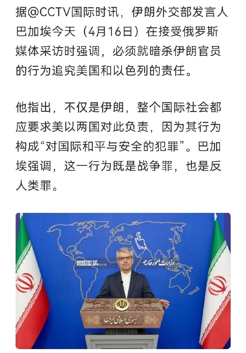 伊朗外交部发言人巴加埃强硬表态:必须追究美以暗杀伊朗官员的责任,这是战争罪,也是反人类罪。