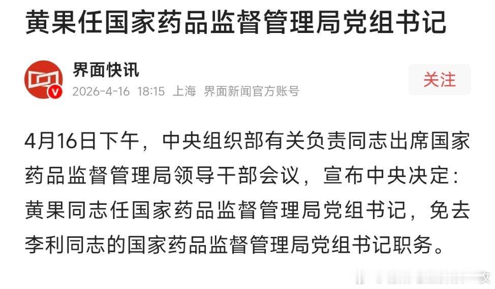黄果任国家药品监督管理局党组书记。