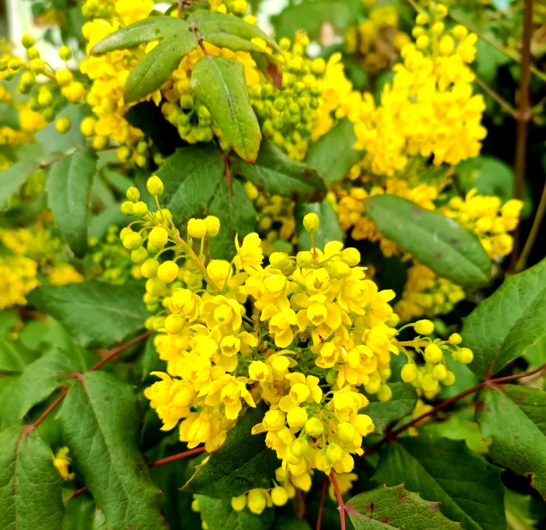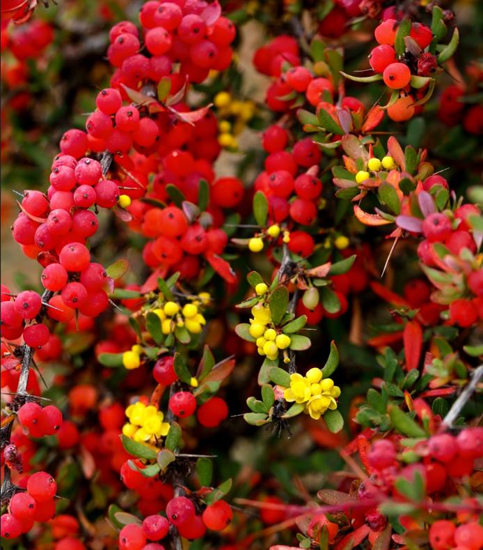 金花小檗植株不高,开金黄色小花,果实是粉红色的,模样小巧耐看,生命力也很强,是很不错的盆景和绿篱材料。