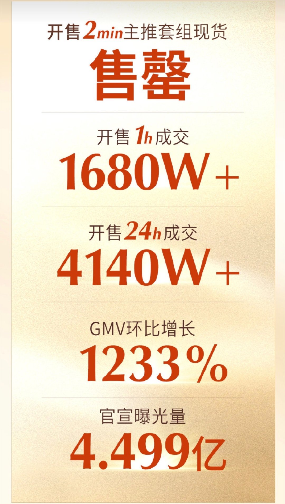 官宣即成王炸,2分钟售罄,24小时引爆4140W+销售额,GMV环比狂飙1233%!一举横扫天猫、抖音、京东三大榜单TOP1。