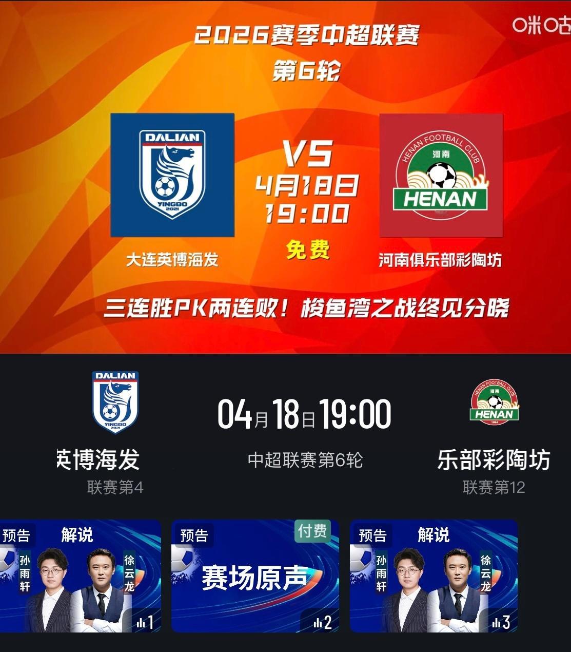 4.18/19:00 中超/大连英博vs河南彩陶坊(咪咕)4.19/00:30 德甲/法兰克福vs莱比锡(球竞/抖音)