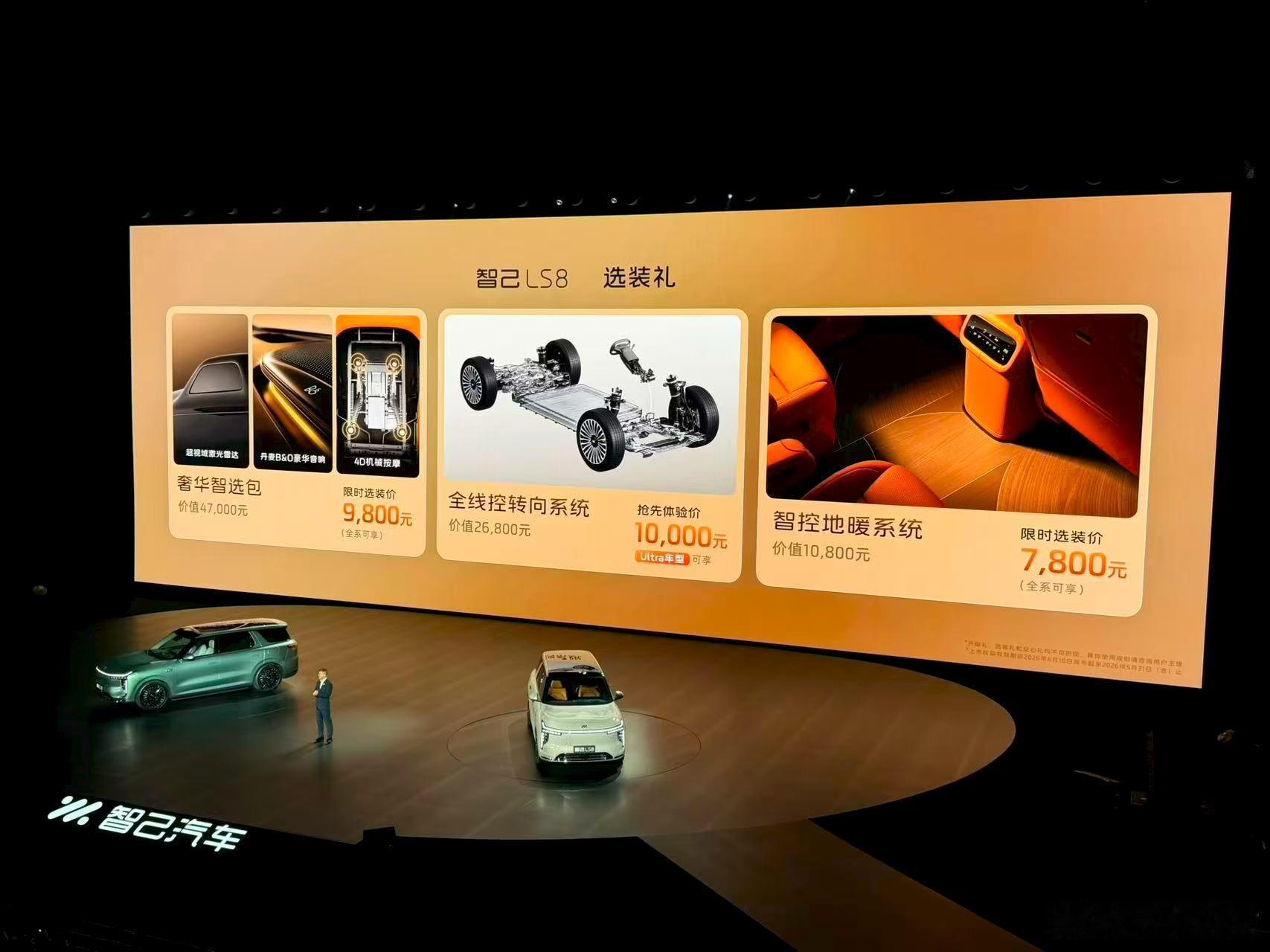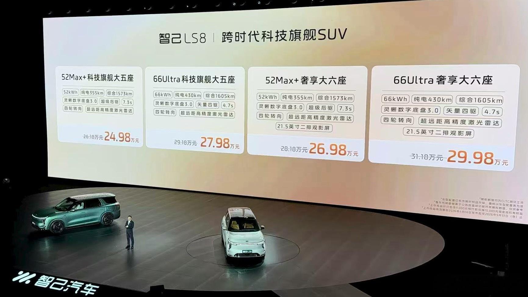 LS8这次主打的还是大空间、高配置和长续航。搭载800V增程平台,纯电最高430km,综合续航1605km,全系标配空悬、四轮转向和激光雷达,整体规格在同级里有一定竞争力。