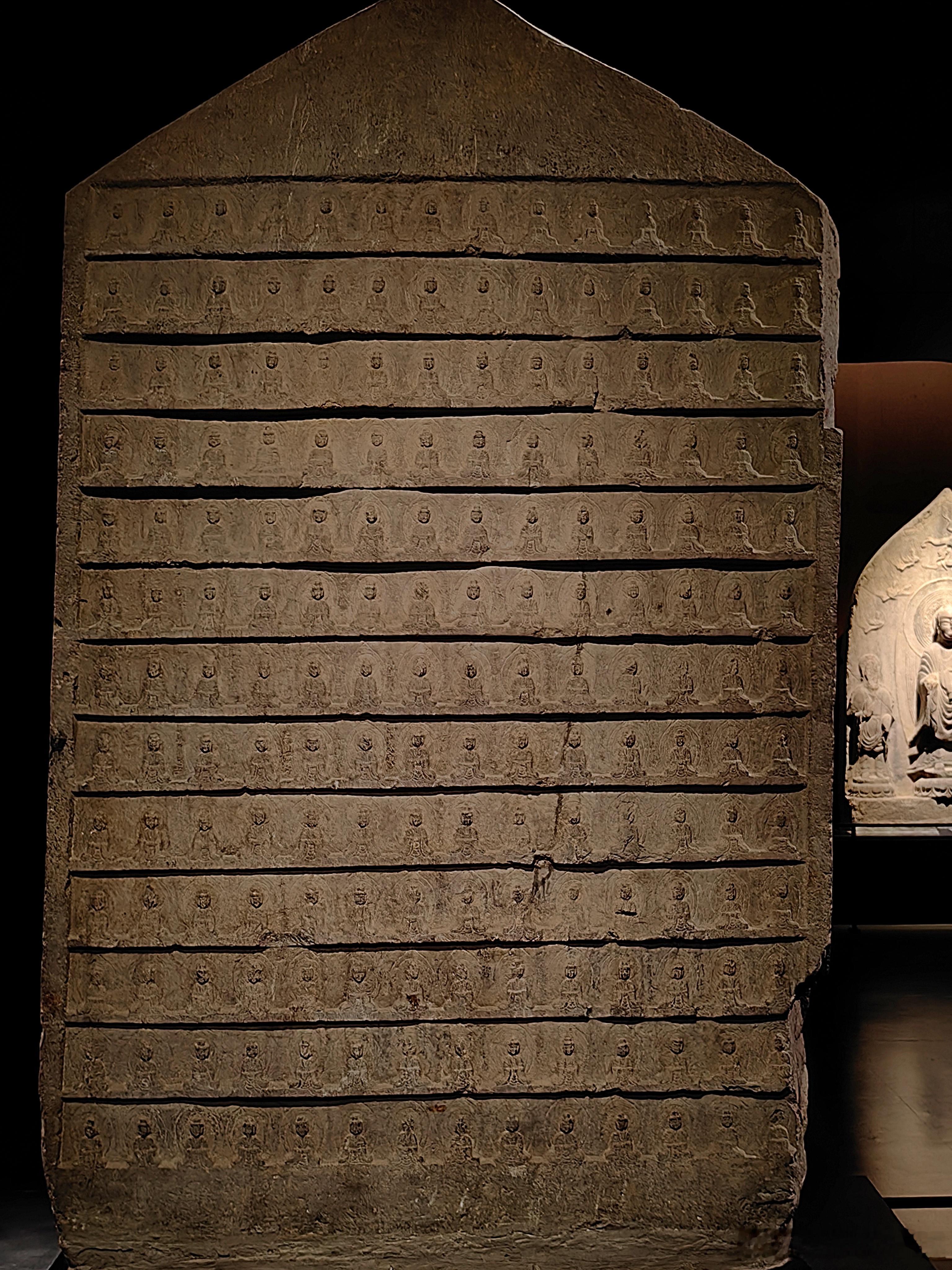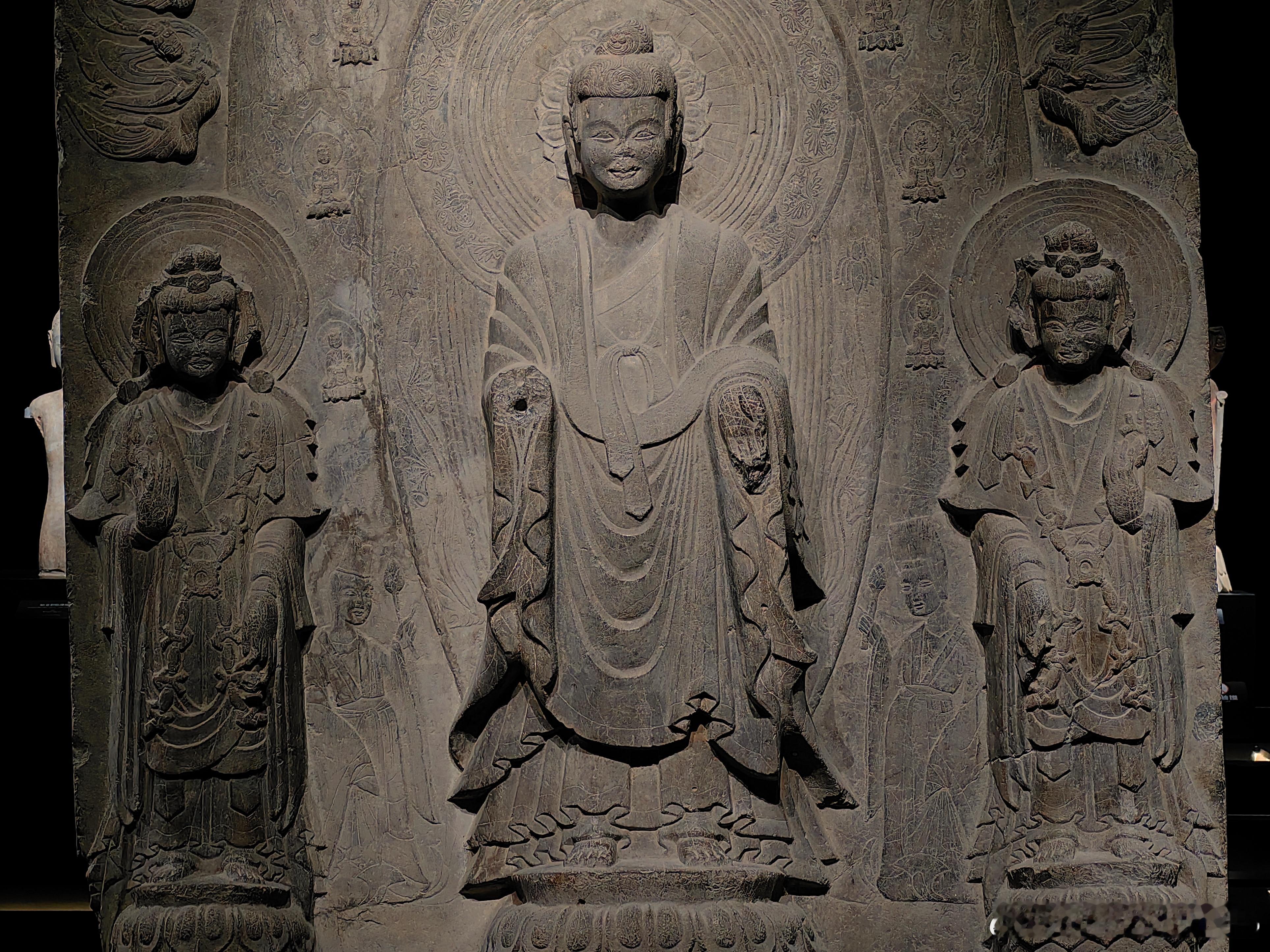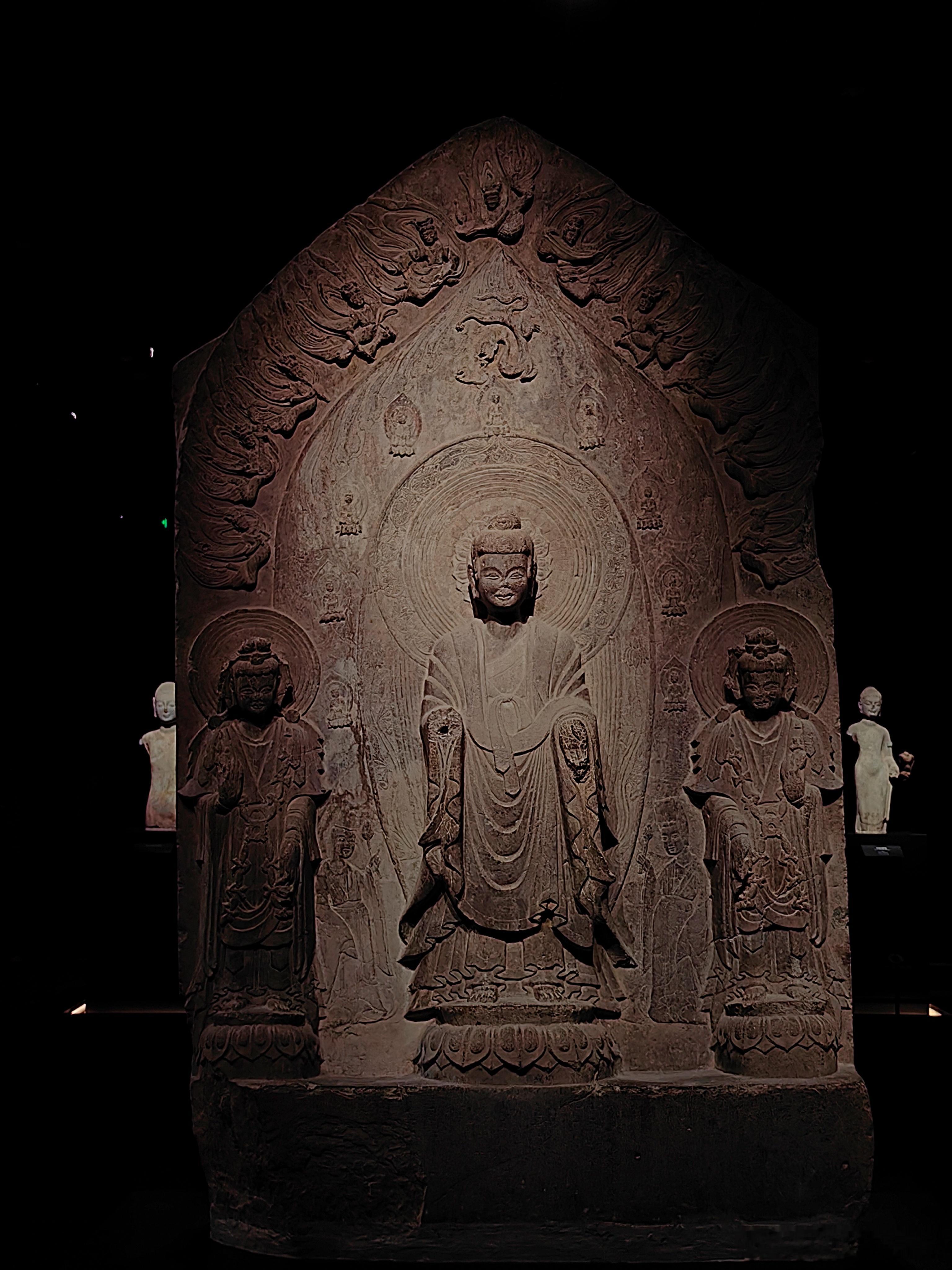 我的2026 贾智渊造背屏式三尊像·北魏正光六年山东博物馆藏山东青州西王孔庄出土。通高2.24米,宽1.41米。正面雕一佛二菩萨,主佛跣足立于覆莲座上。舟形背光内刻九尊化佛,上部雕十一尊伎乐飞天。主佛两侧站立胁侍菩萨,供养人则立于佛菩萨中间位置。背屏左右两侧及碑阴雕196尊坐佛,是为“千佛式”。约会博物馆文物