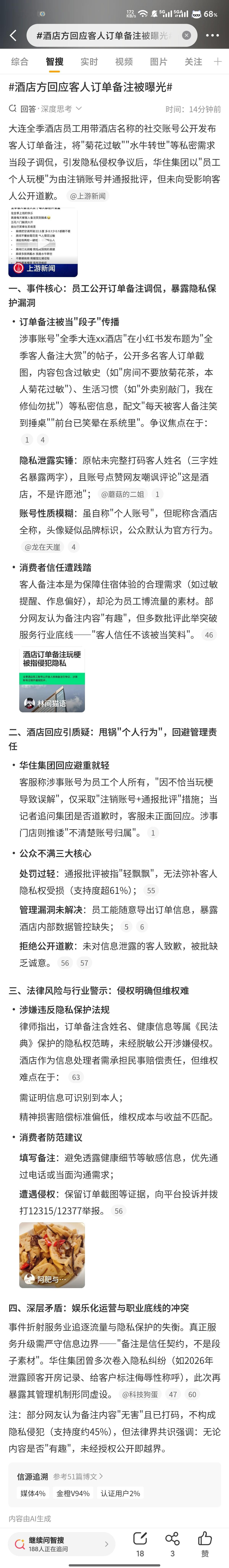 酒店方回应客人订单备注被曝光就事论事来说,全季这次的操作确实是挺离谱的。客人在订单备注过敏史、生活习惯,本质上是寻求住宿时的合理照顾,本身是出于信任。结果酒店把这些私密信息当成段子发到小红书博流量,连客人信息都没打码完整,这对隐私的保护确实做得太差了。更让人不舒服的是,后续华住集团的回应也比较轻描淡写,只是注销账号、通报批评,没有给到客人实质性的道歉和补救。从服务行业的基本底线来看,尊重客人隐私是最基础的,而不是把客户信息当素材,这一点全季是真的没做到。不管是不是“员工个人行为”,品牌管理责任肯定还是有的。服务业靠的就是客户信任,连基本的信息安全都保障不了,确实是很伤消费者的信心。