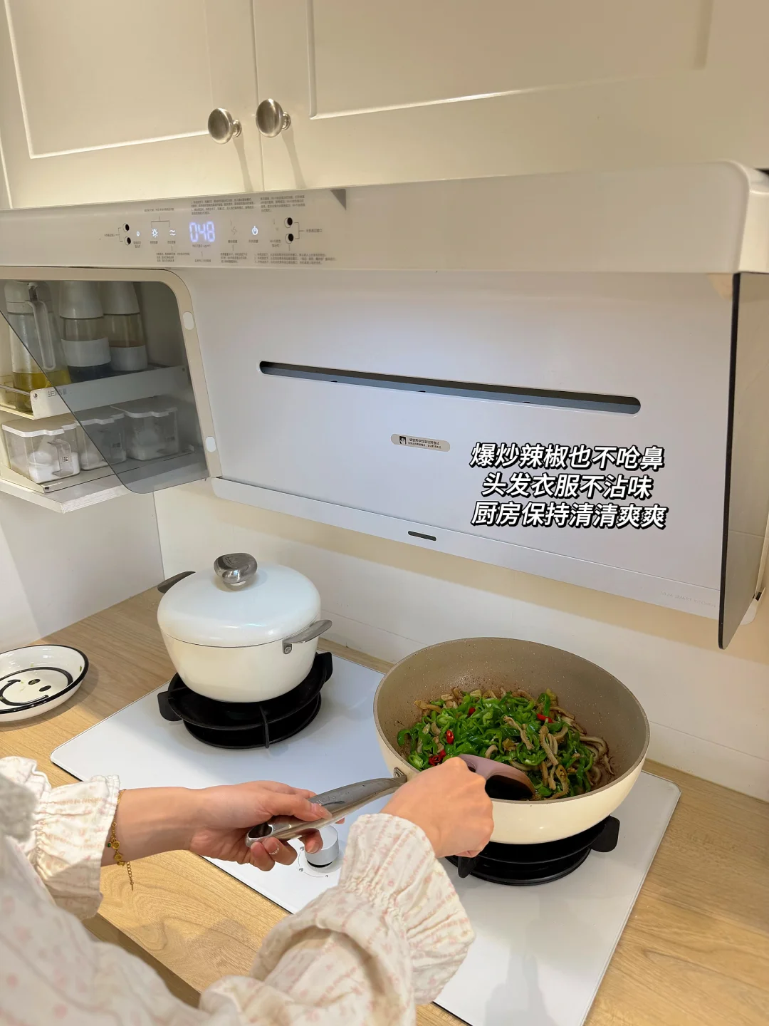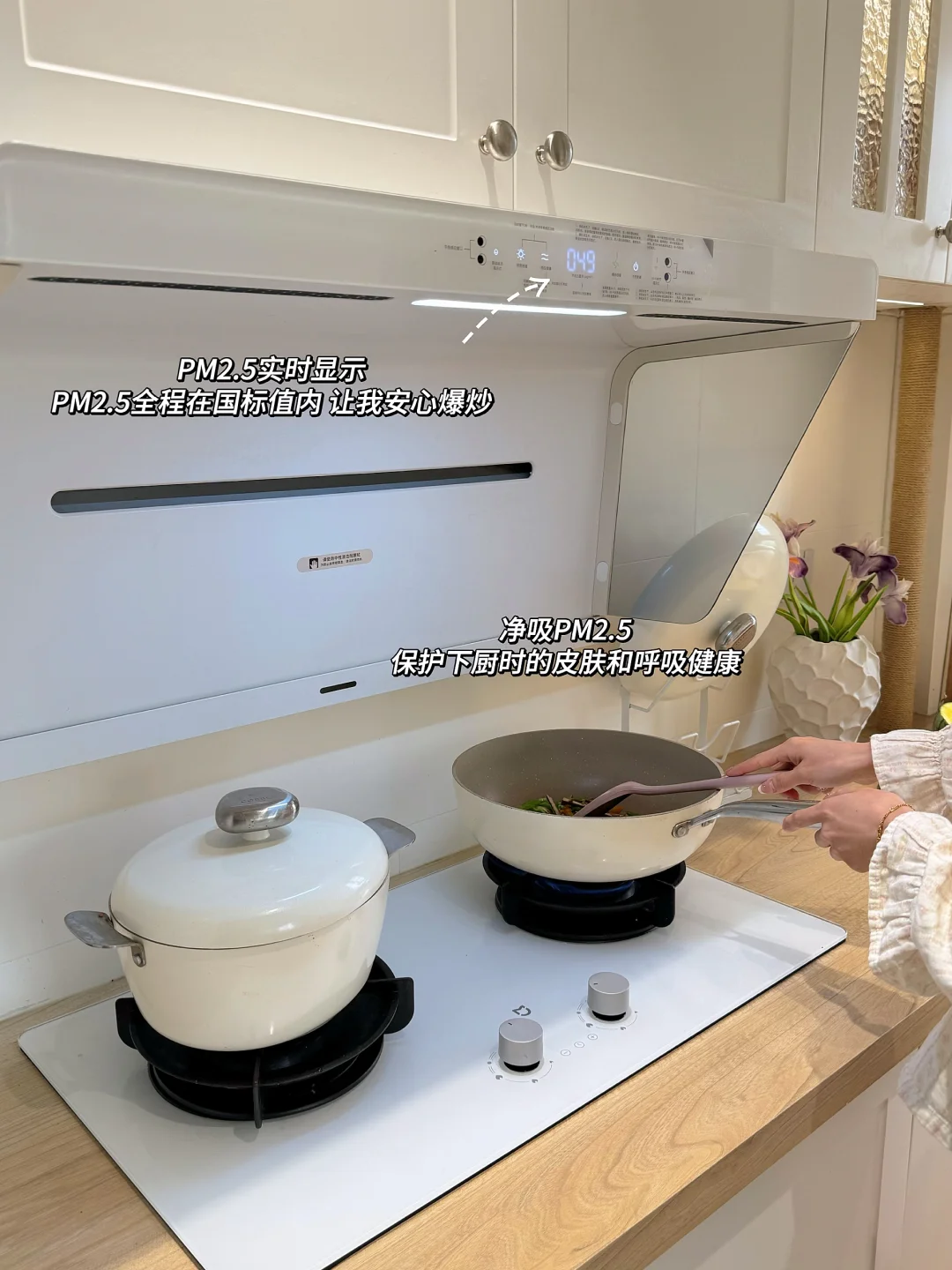净烟机的三重气流组合,不光吸油烟🌬️,连油烟味和PM2.5都能从源头吸走,三重保障让我在厨房炒辣椒也不呛鼻👃🏻,做完饭头发衣服都是清清爽爽的🍃,开放式厨房更能放心爆炒,连我敏感的鼻子也能畅快呼吸了。