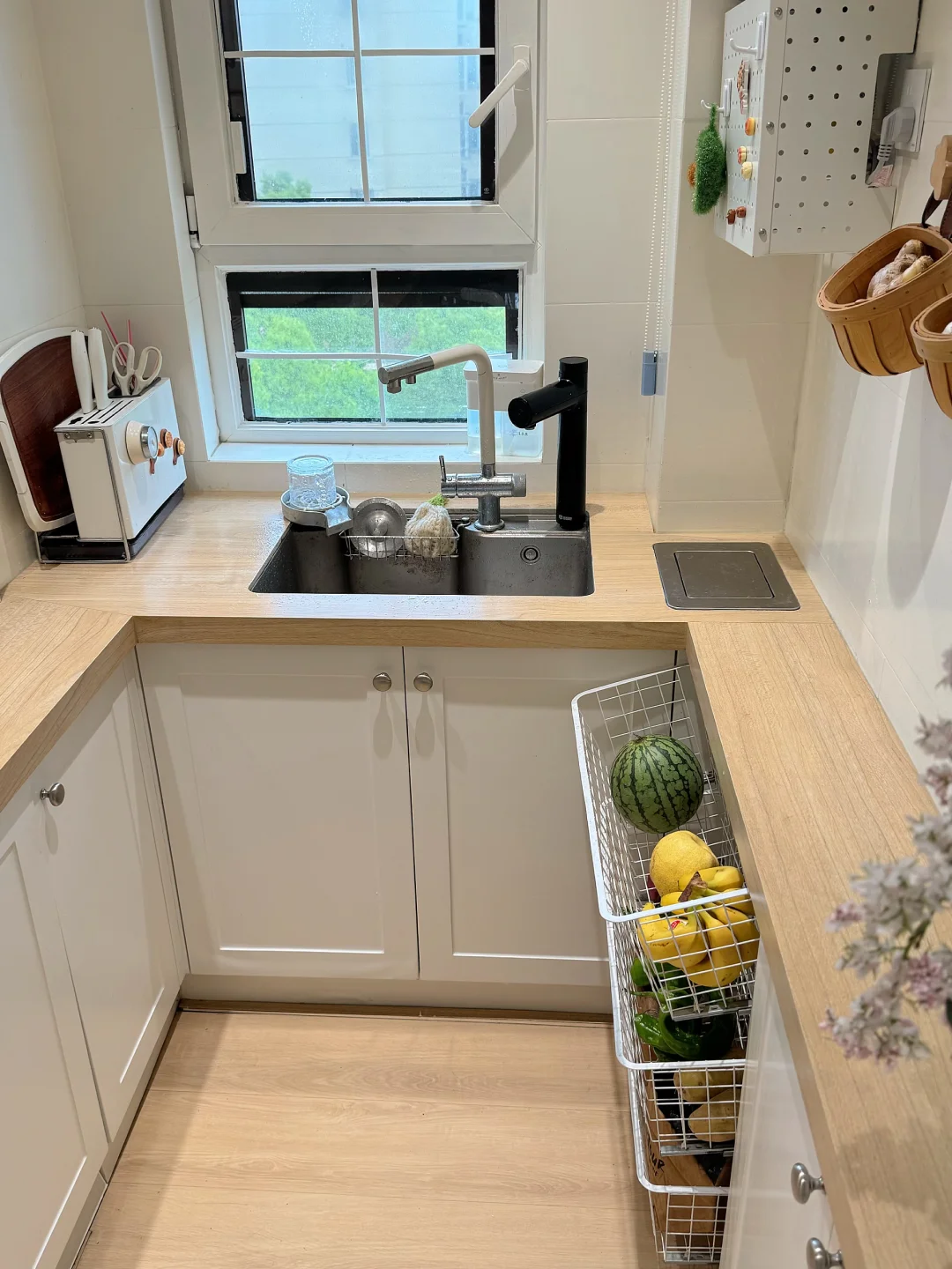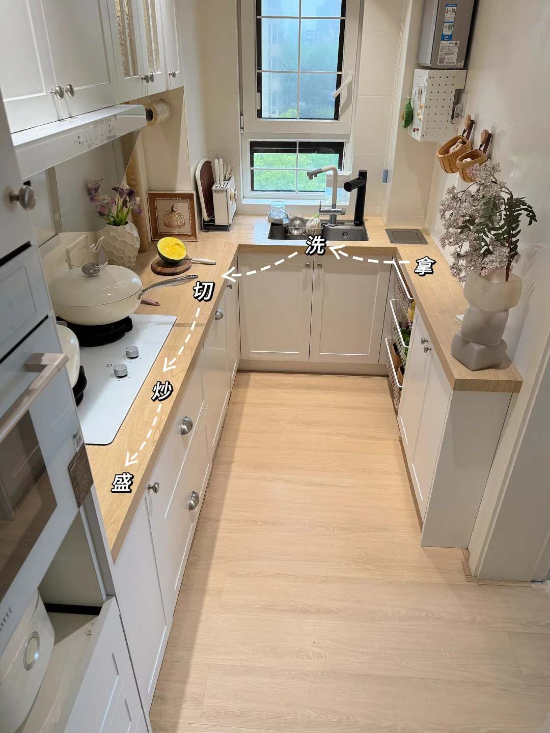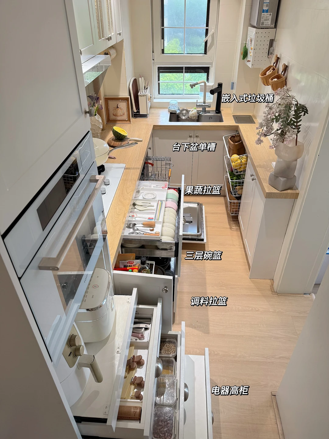 洗→切→炒→盛动线一气呵成🚶🏻♀️,窄吊柜里还自制了升降调料拉篮,不用的时候收上去,台面干干净净💖