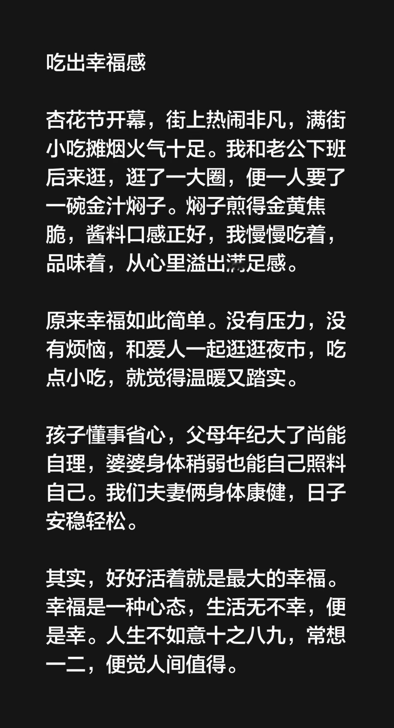 幸福很简单。吃出幸福感 杏花节开幕,街上热闹非凡,满街小吃摊烟火气十足。我和老公下班后来逛,逛了一大圈,便一人要了一碗金汁焖子。焖子煎得金黄焦脆,酱料口感正好,我慢慢吃着,品味着,从心里溢出满足感。 原来幸福如此简单。没有压力,没有烦恼,和爱人一起逛逛夜市,吃点小吃,就觉得温暖又踏实。 孩子懂事省心,父母年纪大了尚能自理,婆婆身体稍弱也能自己照料自己。我们夫妻俩身体康健,日子安稳轻松。 其实,好好活着就是最大的幸福。幸福是一种心态,生活无不幸,便是幸。人生不如意十之八九,常想一二,便觉人间值得。