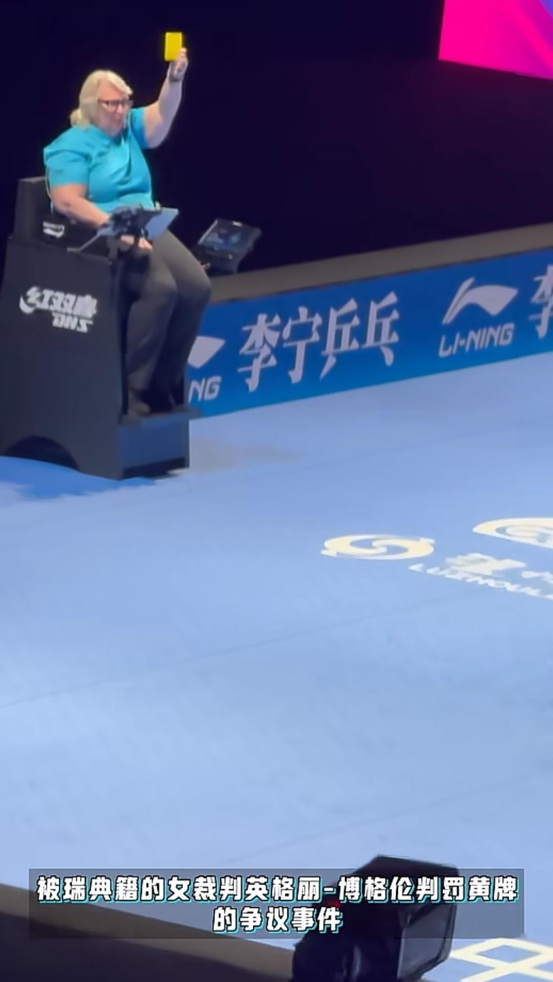 澳门世界杯,这位来自瑞典的白头发大婶裁判名叫英格丽·博格伦,淘汰赛她上场五次,其中两场判了孙颖莎黄牌,而且他的黄牌只给莎莎一个人,不管是孙颖莎发球,还是对手发球,她的判罚黄牌统统给了莎莎一个人。
