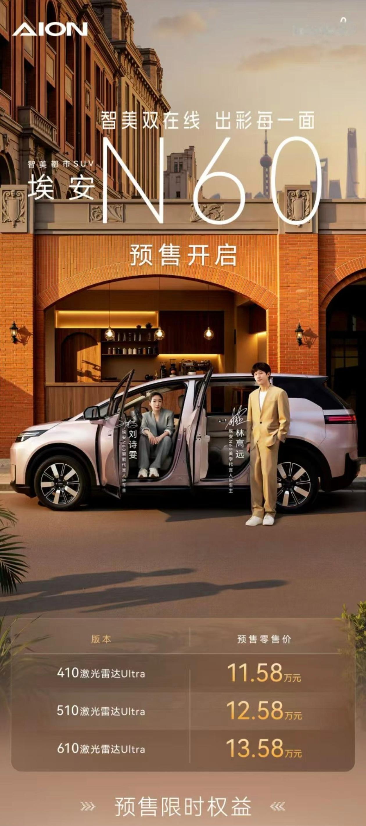 埃安N60全系标配高阶智能11.58万元起 又一个标配激光雷达的,埃安N60正式预售, 共推出3款,预售价11.58-13.58万。全系标配副驾零重力、前排加热,吸风式通风,按摩,带遮阳帘的全景天幕,激光雷达,4D毫米波雷达,可实现高阶辅助驾驶(带离车泊入)等。续航最高610公里.这车我们之前拍过视频,空间在同级里非常大,门洞也大,上下车很方便.感兴趣的同学可以在我们的账号下搜索了解下埃安N60一度电多跑一公里 埃安N60