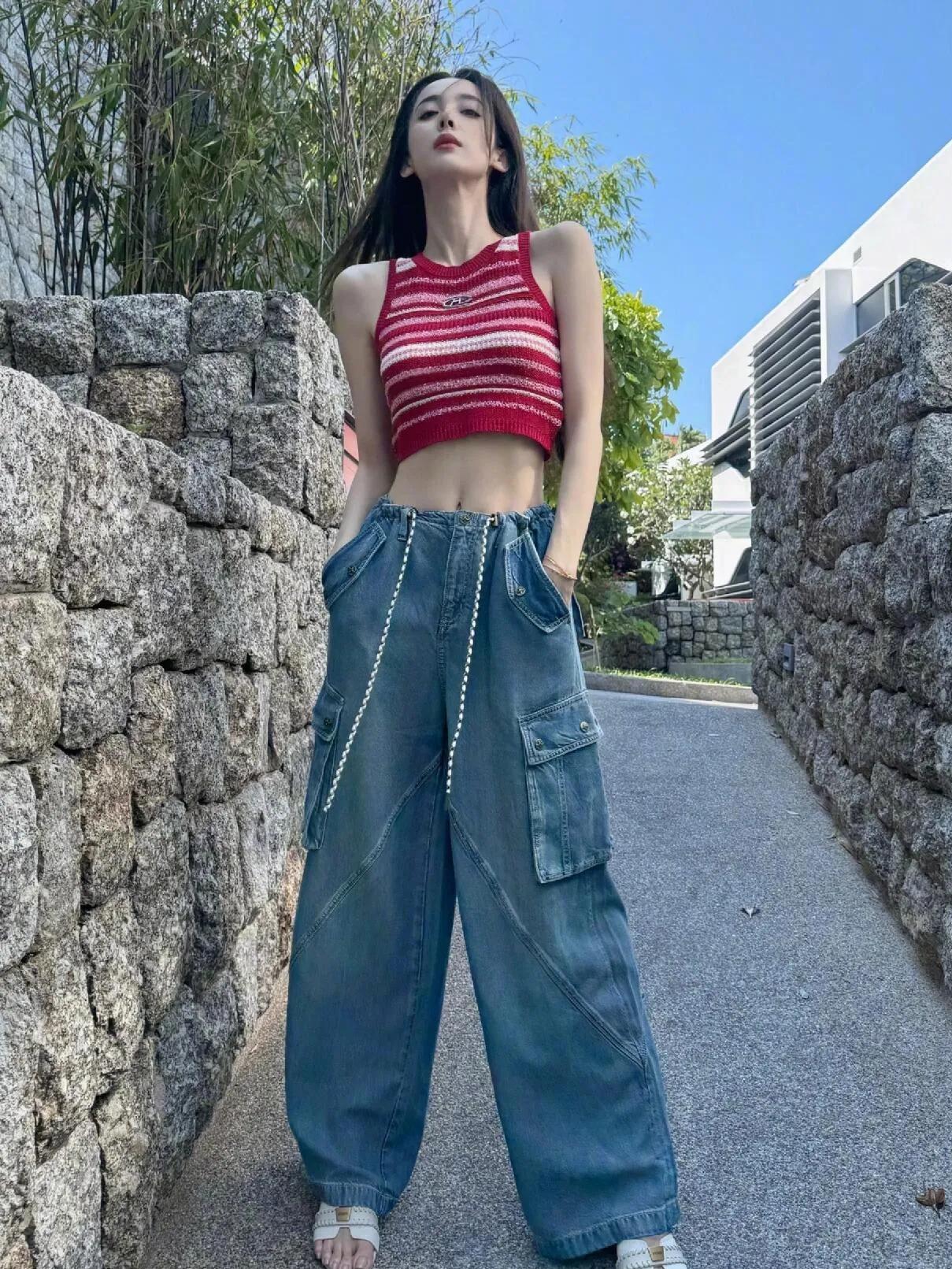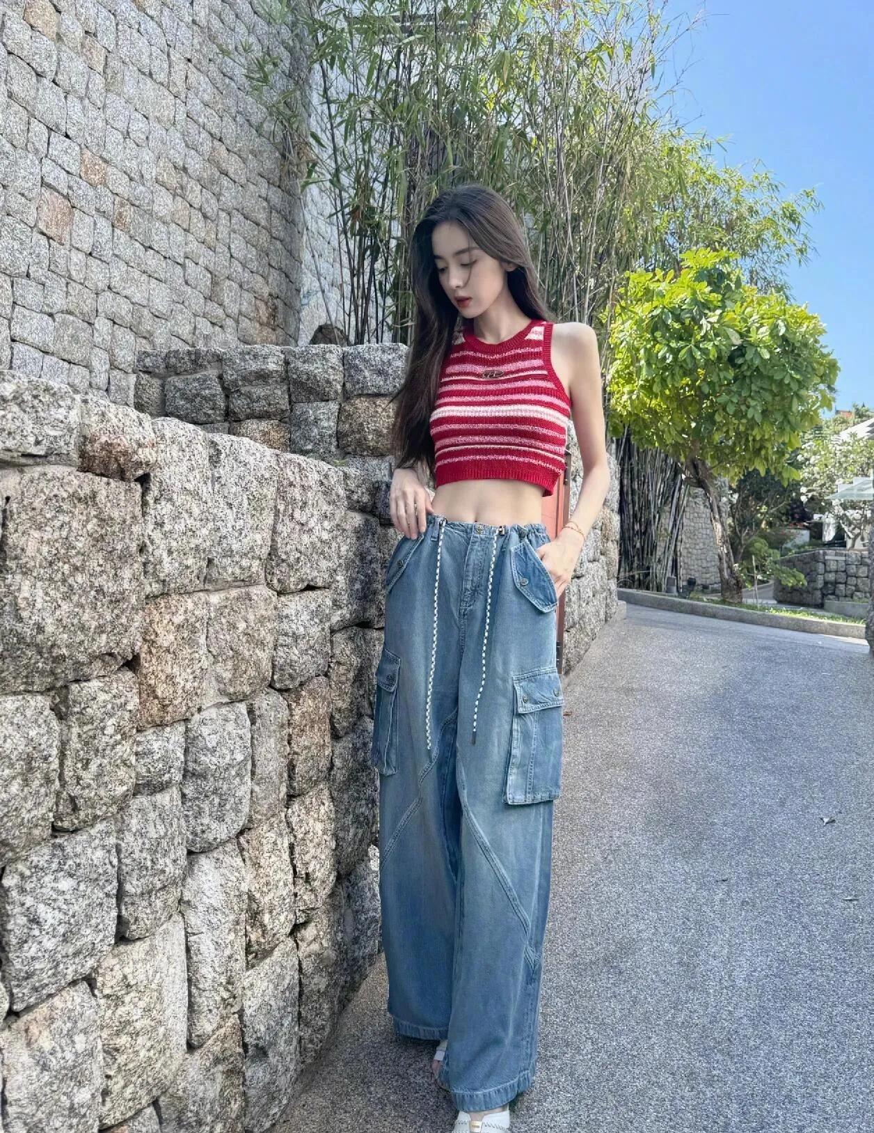 红白条纹背心+工装阔腿裤,又甜又酷,娜扎的身材也太绝了吧!