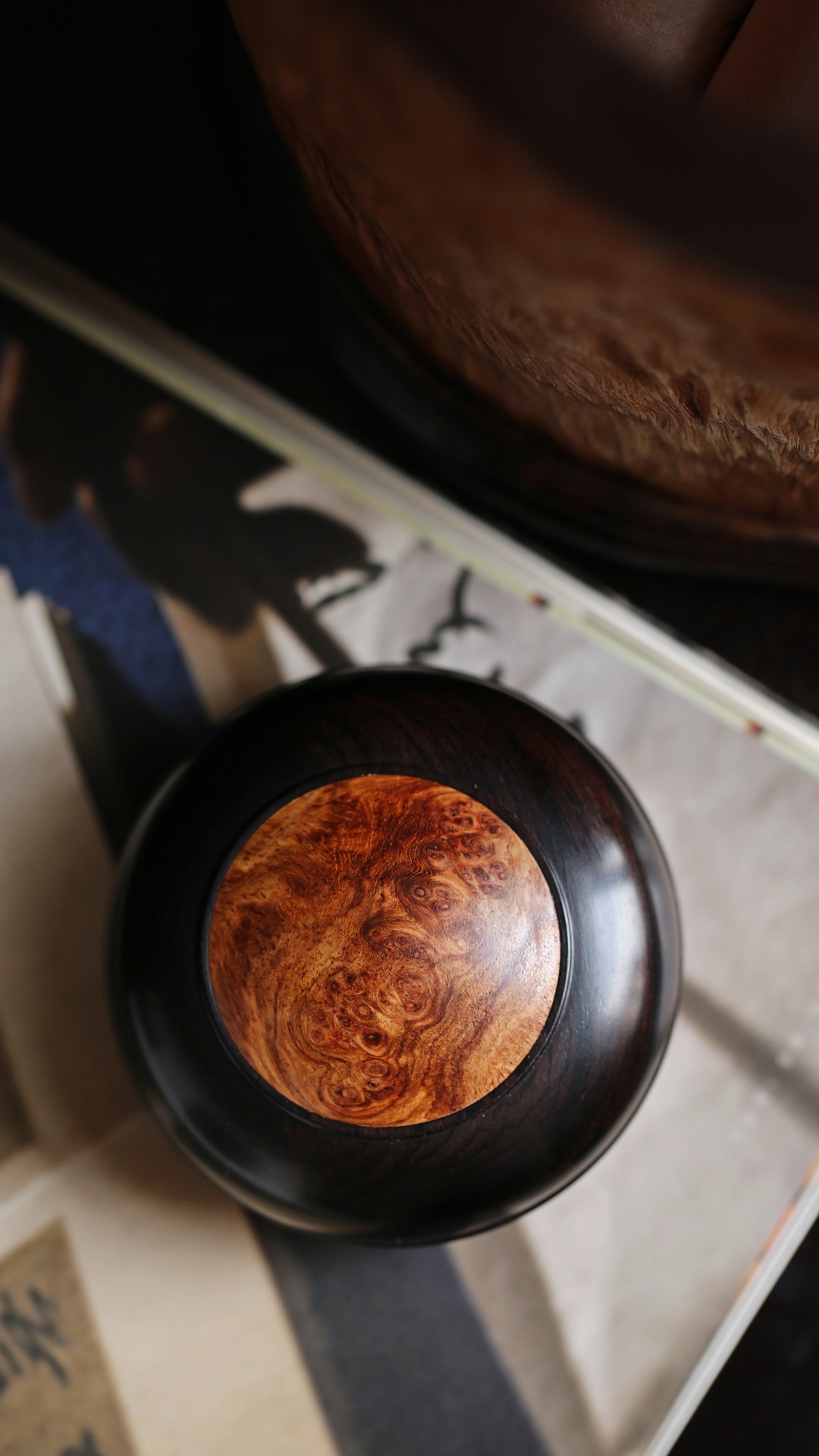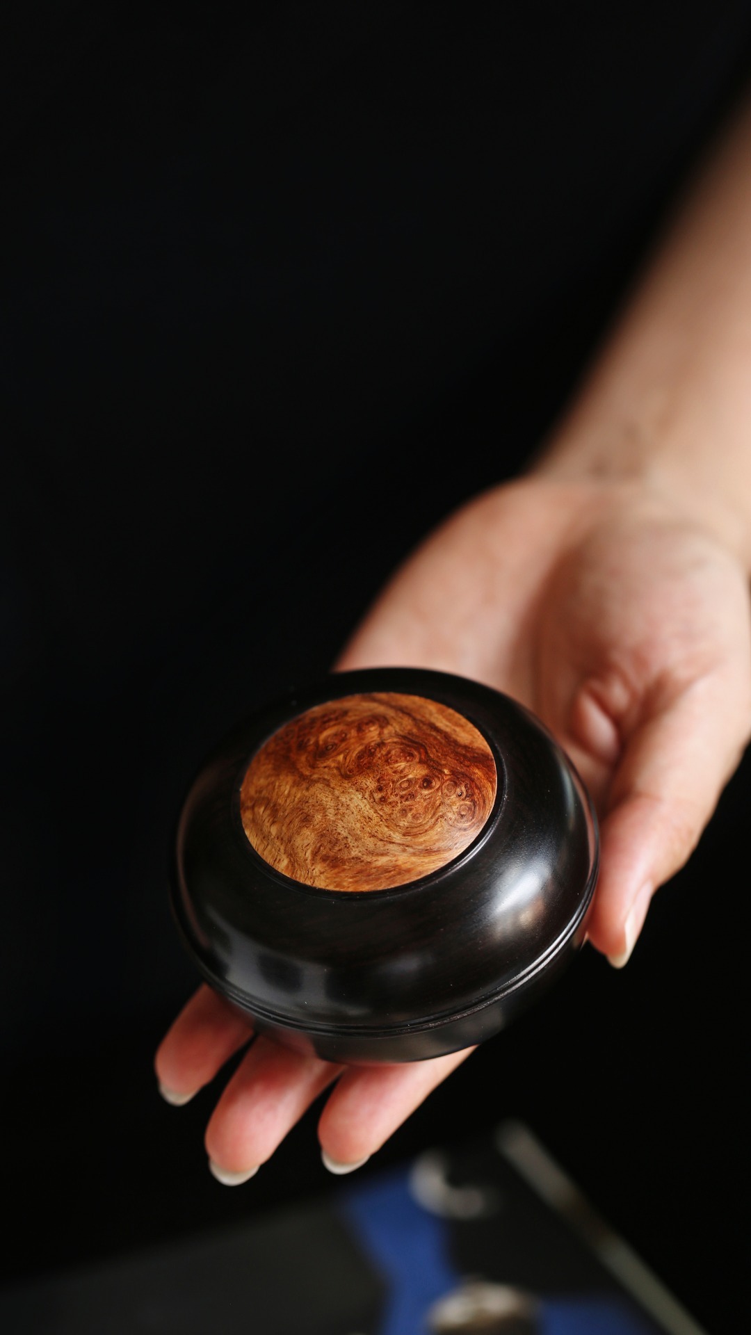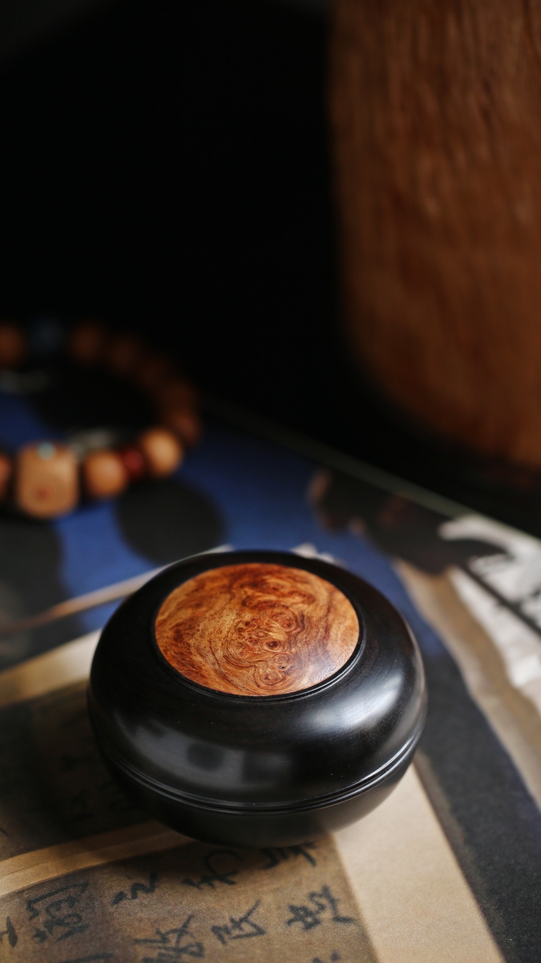 紫光檀嵌缅花·印泥盒盖盒嵌榴疤缅花,清雅隽丽,温润如玉,秀美文静,可珍可赏。直径