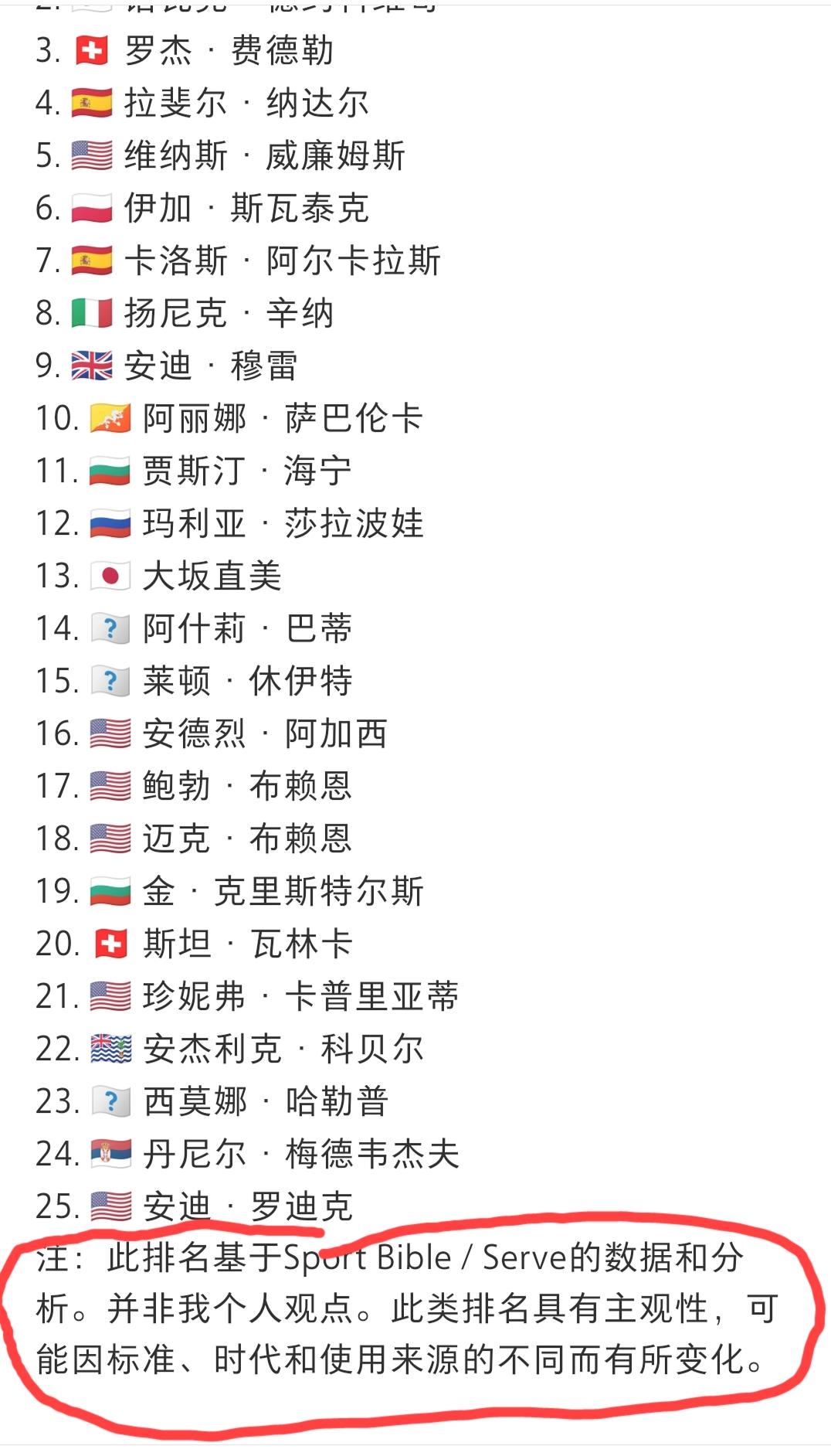 21世纪最伟大的网球运动员排名top25。