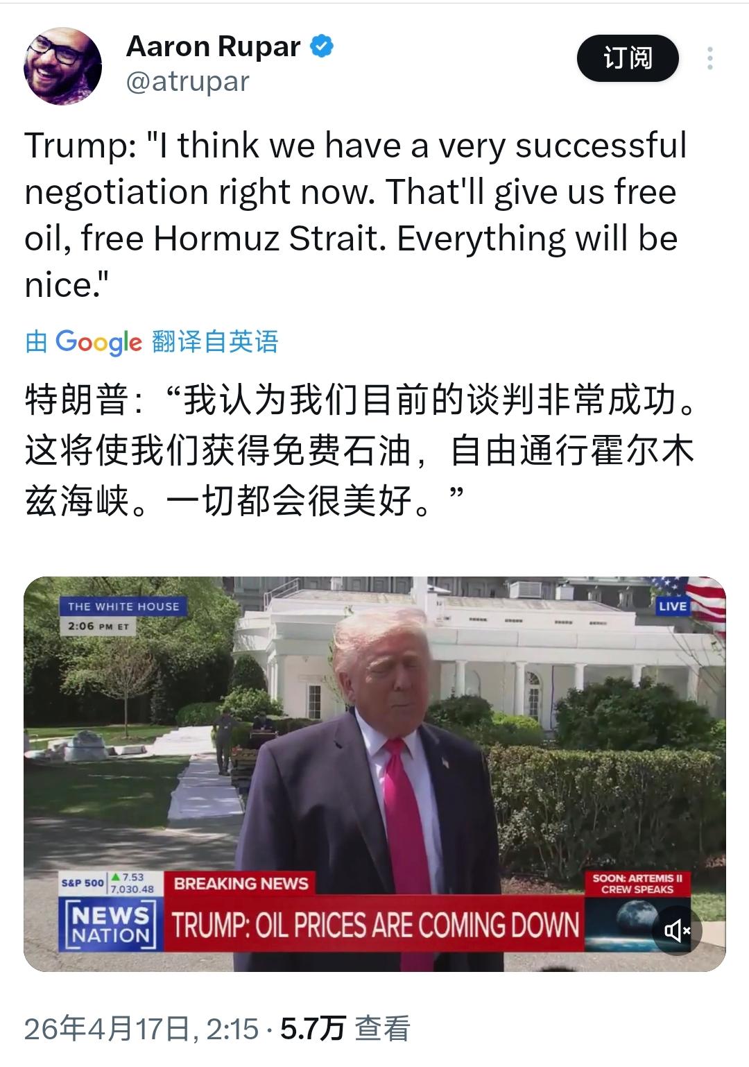 特朗普今天(北京时间4月17日)接受采访时表示:“我认为我们目前的谈判非常成功。这将使我们获得免费石油,自由通行霍尔木兹海峡。一切都会很美好。”