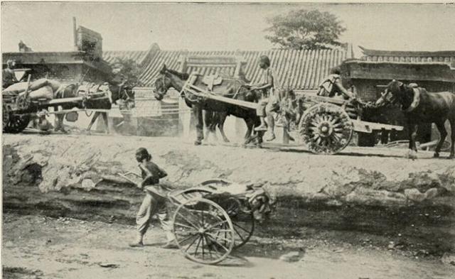 1901年,北京街头,高低错落的道路上,数辆由骡马牵引的大车,车轮巨大,车身上载