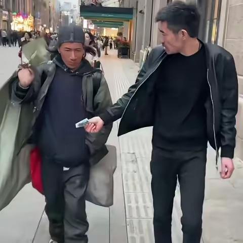 发现迎面走来一位拎着个大号蛇皮口袋,头发凌乱的流浪大哥。阿四赶忙走上前去,掏出一张50块钱递给他,谁知这流浪大哥瞥了一眼后,噘着嘴摇了摇头没有接。阿四想直接塞进他口袋里,流浪大哥立马躲开并说道:“不要!不要!”随即便加快脚步离去了。[捂脸]