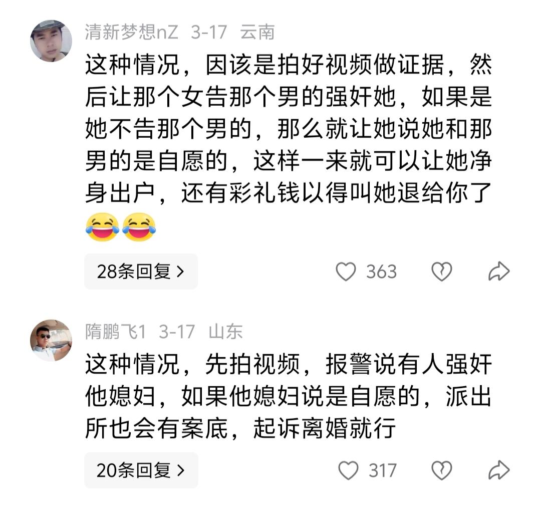 网友热评:这种情况,先拍视频,报警说有人强奸他媳妇,如果他媳妇说是自愿的,派出所也会有案底,起诉离婚就行。