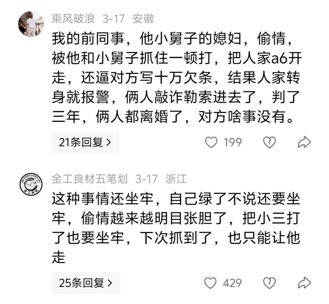 网友热评:我的前同事,他小舅子的媳妇,偷情,被他和小舅子抓住一顿打,把人家a6开走,还逼对方写十万欠条,结果人家转身就报警,俩人敲诈勒索进去了,判了三年,俩人都离婚了,对方啥事没有。