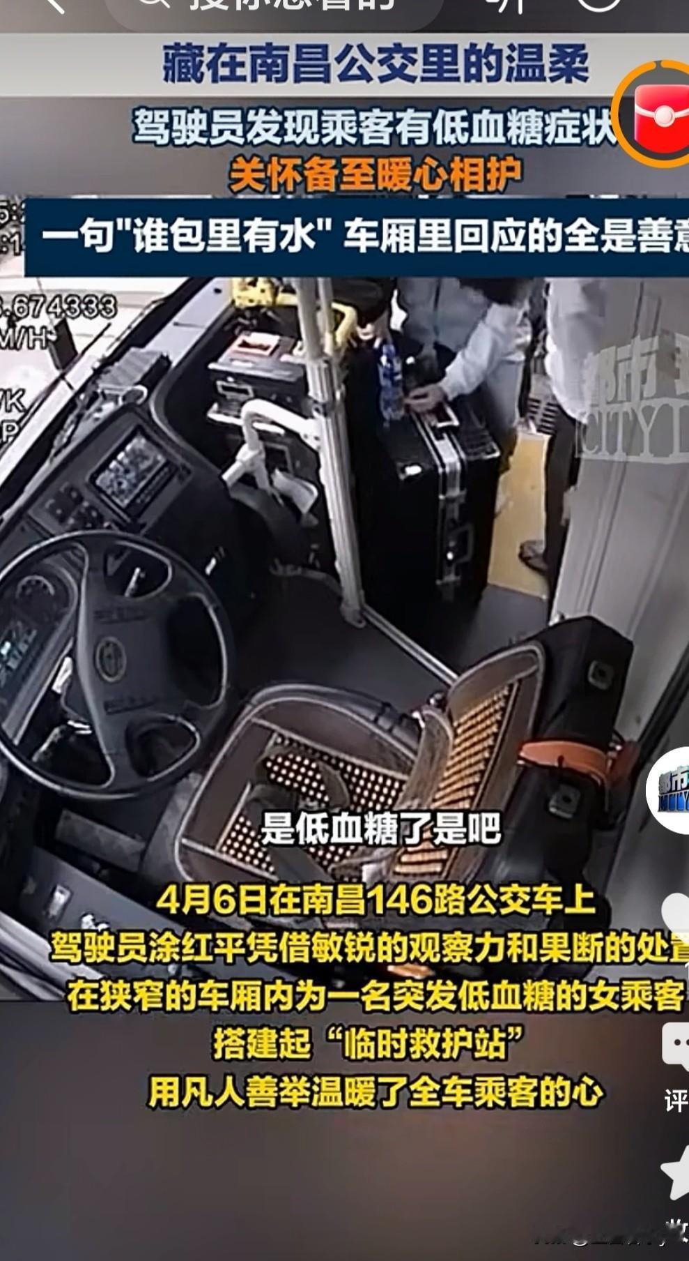 司机师傅从他车上的柜子里拿出预先准备好的饼干类零食送给乘客,问车里人谁包里有水呀?车里乘客纷纷拿出自己的水要送给低血糖的乘客。