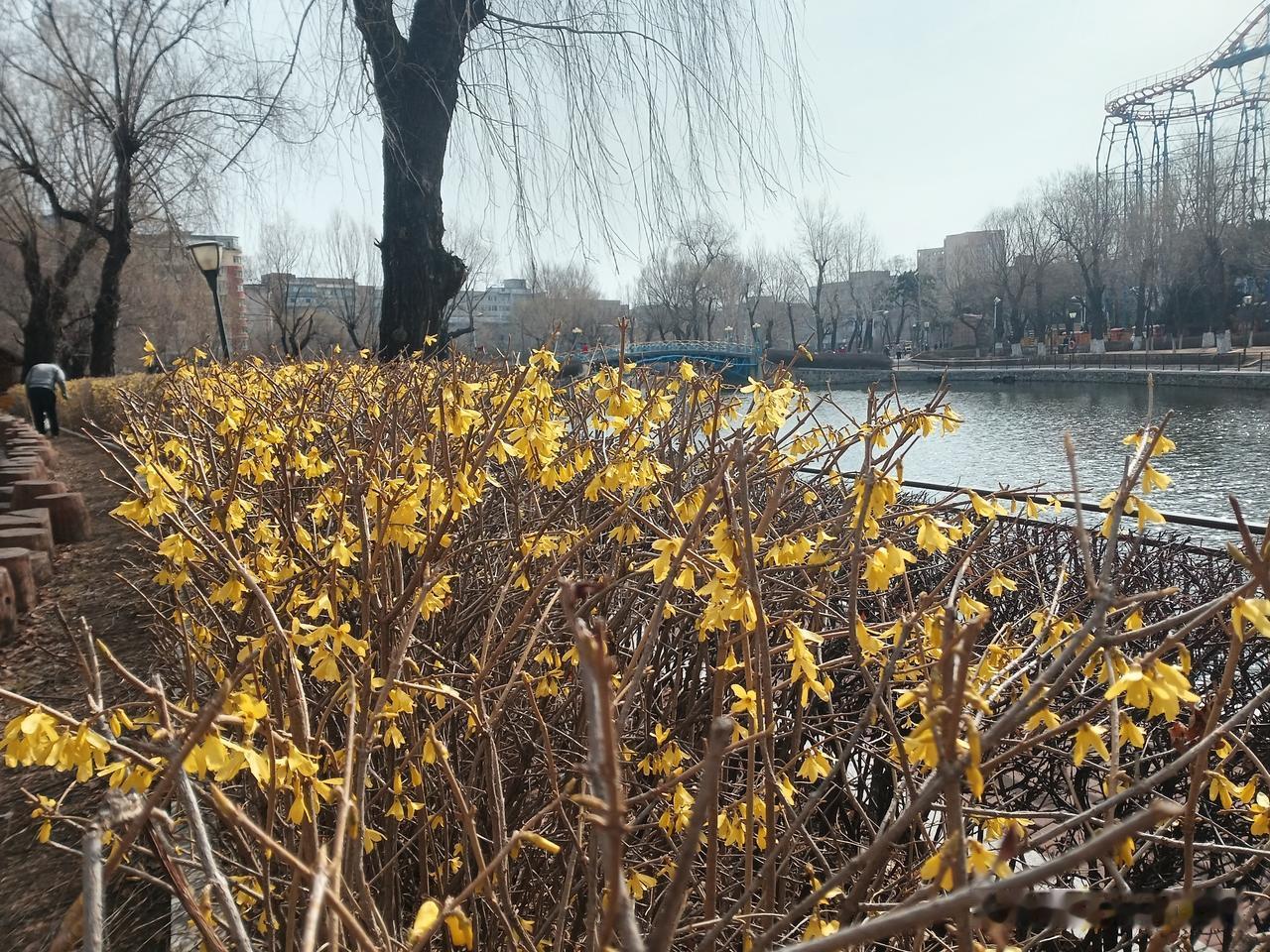 回来的路上,我发现,连翘花开了,满眼金黄,这个花是开的最早的花。