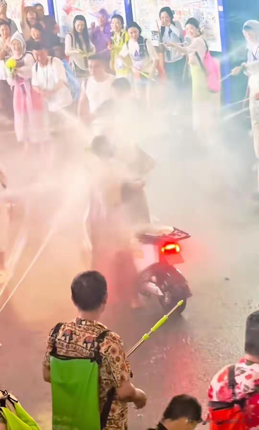 还有人专门拿着高压水枪,对着人的眼睛、脸部部位猛喷,甚至有人从高楼往下泼水,还有人撕扯游客的雨衣,对骑车的人疯狂喷水,导致不少人差点滑倒、摔倒,引发了多起冲突。